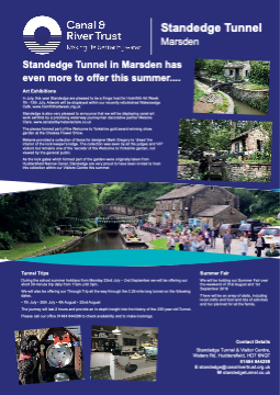 Out and about Standedge Tunnel Marsden Standedge Tunnel in Marsden has even more to offer this summer.... Art Exhibitions In July, this year Standedge are pleased to be a fringe host for Holmfifirth Art Week 7th -13th July. Artwork will be displayed within our recently refurbished Watersedge Caféé. www.holmfifirthartweek.org.uk Standedge is also very pleased to announce that we will be displaying canal art work exhibits by a practising waterway journeyman decorative painter Melanie Clare. www.canalartbymelanieclare.co.uk The pieces formed part of the Welcome to Yorkshire gold award winning show garden at the Chelsea Flower Show. Melanie provided a collection of items for designer Mark Gregory to ‘dress’ the interior of the lock keeper’s lodge. The collection was seen by all the judges and VIP visitors but remains one of the ‘secrets’ of the Welcome to Yorkshire garden, not viewed by the general public. As the lock gates which formed part of the garden were originally taken from Huddersfifield Narrow Canal, Standedge are very proud to have been invited to host this collection within our Visitors Centre this summer. Tunnel Trips During the school summer holidays from Monday 22nd July – 2nd September we will be offering our short 30-minute trip daily from 11am until 3pm. We will also be offering our Through Trip all the way through the 3.25-mile long tunnel on the following dates. • 7th July • 25th July • 4th August • 22nd August The journey will last 2 hours and provide an in-depth insight into the history of the 200 year old Tunnel. Please call our offifice 01484 844298 to check availability and to make bookings. Summer Fair We will be holding our Summer Fair over the weekend of 31st August and 1st September 2019 There will be an array of stalls, including local crafts and food and lots of activities and fun planned for all the family. Contact DetailsStandedge Tunnel & Visitor CentreWaters Rd, Huddersfifield, HD7 6NQT01484 844298E standedge@canalrivertrust.org.ukW standedgetunnel.co.uk www. SADDLEWORTH.co.uk Around