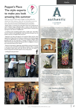 Poppet’s Place The style experts to make you look amazing this summer With an eye for style and a fifinger on the pulse for whats hot this season, then let we introduce you to a new, fun and forward thinking private boutique. Poppet’s Place, is owned by the lovely Marie Travis and is helped by her team of fashion hungry enthusiasts. After a career in sales and over 2 years in perfecting her knowledge of the industry, Marie is excited about starting her new venture in Saddleworth. “I wanted to start something positive after a health scare.” Says Marie. My love of fashion and helping ladies make themselves feel great was the perfect outcome, so Poppet’s Place was born.” Catering for all sizes and styles for all occasions, Marie and her team regularly post blogs, videos and hilarious outtakes on their facebook page. To book an appointment to visit Marie at the fabulous Poppet’s Place Boutique, then you can send them a message via facbook. Once there, Marie and the team will guide and help you with no obligation to buy, so just come and browse at your leisure. If anyone is interested in organising a special fashion event at local venues or at home, then send Marie and the ladies at Poppet’s Place a message on Facebook today where you’ll also fifind all the news and details of forthcoming events and latest styles for the coming season. Looking good just got better! Poppets Place enjoying a pop-up fashion shop at the The Three Crowns Viki and David Taylor welcome you to Authentic, a wonderful gift shop/gallery in the heart of Uppermill. It is a treasure trove of unique, high quality, handmade gifts. With over 40 local artisans ranging from jewellery, artwork, wood, glass, dog beds made from whisky barrels, photography, leather work, map papercuts and robots, to name a few. You can see our robots being made on BBC One’s programme, Money For Nothing. Some of the 40 local artisans are Woozlewood, Sara V Gartside Designs, Jan Davey, Steve Robinson Photography, Olganna, Bits and Bobbins and Wood Dragon Arts. “By its very nature handmade is unique. These products have never seen a production line, which is why we are so passionate about them. Our artisans of course want to make a living from their work, but there is much more to it than that. Each piece is created with a little love, combined with a great deal of passion and skill.” Viki (Authentic Co-owner) Gift Vouchers available Opening hours: Tuesday to Saturday 10am - 5pm . Sunday 12 Noon - 4pm 2a Mill Street . Uppermill . Saddleworth . OL3 6HT . (Opposite the museum car park, behind Hei Hei takeaway) Tel: 07305 996705 Facebook /Authenticuppermill www.authenticuppermill.com www. SADDLEWORTH.co.uk Fashion Around