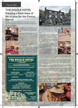 Out and About THE DIGGLE HOTEL Enjoying a fresh lease of life in time for the Festive Season Saddleworth has many hidden treasures, but one in particular has been getting the taste buds wagging in the heart of Diggle. The Diggle Hotel has been taken over by a passionate landlord who is aiming to place this historic Inn well and truly back on the culinary map. Bill McCann has injected a fresh lease of life into the place after many years of success within the industry. He is currently applying his knowledge and enthusiasm into good use, along with the rest of the small team, to make The Diggle Hotel one of the great local destinations of choice. Its open plan and cosy interior, outside garden terrace and large private car park makes it the perfect setting for either an intimate dinner for two or a large private party. As the Festive weather creeps ever nearer, we arrived at the quaint establishment, which exudes a unique charm and character. We were warmly welcomed by the charming Bill, who kindly showed us to our table situated by the window with lovely views of the Saddleworth hills. We then began to peruse the mouth-watering menu on offer, created by Bill himself who has worked his culinary magic for many years. Obviously a man of many talents. Bill has conjured up a new and exciting traditional menu which has something for absolutely everyone, including an impressive Specials Board, and a mouth watering local game pie (available Tuesday to Friday between 4pm - 8pm, Saturday 12 Noon - 8pm and Sundays 12 Noon - 7pm). After a brief discussion with Bill about his recommendations, we were more than happy to go with the Steak Deal for £15 which looked fantastic. On arrival, the steak platters were certainly plentiful, so make sure you’ve got a healthy appetite before embarking on this culinary adventure.The rib-eye steaks were cooked to perfection and were well complimented by home cooked chips, portabello mushrooms and fresh tomatoes.There was even a side plate of additional seasonal vegetables as well baked cauliflflower cheese which was unexpected but a tasty side dish. To fifinish off the feast, we simply enjoyed one of the fantastic wines on offer, even though a delicious looking desserts menu was offered to us.This was certainly a great culinary adventure to remember, and up there with the very best. Certainly one to try this Festive season. One thing you can guarantee at The Diggle Hotel is incredible value for money with the Menu of the Day offering two courses for only £15. Alongside the new menu, a fabulous Sunday Roast option is there for you all to enjoy, including a great Children’s menu....and don’t forget....Christmas Bookings are now being taken with a Festive Menu running alongside a changing specials board. For those in need of a place to stay, then there are four ensuite bedrooms available. There is also a Quiz Night every Thursday from 9pm with some great prizes up for grabs. For all up and coming news and events, including regular live entertainment, please contact Bill and the team on Tel: 01457 872741. MERRY CHRISTMAS and HAPPY DINING! Bill and all the team would like to welcome you to THE DIGGLE HOTEL Station Houses . Diggle . Saddleworth . OL5JZ Tel: 01457 872741 Now under NEW MANAGEMENT Wishing everyone a very Merry Christmas and Happy 2019! NEW traditional menu now available Sunday Lunches 2 Courses ONLY £15 Starter £6 | Main £13 | Sweet £5 Opening Times Monday from 5pm (Drinks Only) Tuesday - Friday 4pm - 8pm Saturday 12 Noon - 8pm Sunday 12 Noon - 7pm STEAK DEALS CHRISTMAS BOOKINGS NOW BEING TAKEN (Festive Menu will run alongside a Daily Specials Menu) QUIZ NIGHT Every Thursday from 9pm Great prizes up for grabs including Rafflfflffle and Fantastic Home Cooked Supper (COMING SOON.... HARRY POTTER QUIZ) Regular Theme Nights....Contact for details 4 ENSUITE BEDROOMS Dog Friendly Open Fire Great Atmosphere AVAILABLE .A A A Ar r r ro o o ou u u u n n n nd d 1 dS 1 2 2 w d w w ww w. S SA A A D D D D D DL L L E E EW W WO O OR R R T T TH H H. . . c c co o o . . . u u uk k k