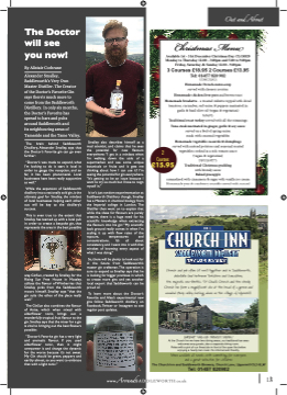 Christmas Menu Available 1st - 31st December Christmas Day CLOSED Monday to Thursday 12.00 - 3.00pm and 5.00 to 9.00pm Friday, Saturday & Sunday 12.00 - 9.00pm 3 Courses £18.95 2 Courses £13.95 Tel: 01457 820 902 STARTERS Homemade French onion soup served with cheesey crouton Homemade chicken liver pate and brown toast Homemade brushetta - a toasted ciabatta topped with diced tomatoes, cucumber, red onion & peppers marinated in garlic & basil olive oil (vegan & vegetarian) CMAINS Traditional roast turkey served with all the trimmings Tuna steak marinated in ginger, garlic & soy sauce served on a bed of spring onion mash with seasonal vegetables Homemade vegetable casserole & dumplings served with sauteed potatoes and seasonal roasted vegetables cooked in a rich tomato sauce (vegan & vegetarian) DESSERTS Traditional Christmas pudding with brandy sauce Baked pineapple caramelised with cinnamon & sugar with vanilla ice cream Homemade pear & cranberry crumble served with custard 2 Courses £15.95 The Chur DLEWORTH.co.uk 13 1 The Doctor will see you now! By Alistair Cochrane Alexander Smalley, Saddleworth’s Very Own Master Distiller. The Creator of the Doctor’s Favorite Gin says there’s much more to come from the Saddleworth Distillery. In only six months, the Doctor’s Favorite has spread to bars and pubs around Saddleworth and its neighbouring areas of Tameside and the Tame Valley. The brain behind Saddleworth Distillery, Alexander Smalley, says that the Doctor’s Favorite gin can go even further: “Doctor’s was made to expand, what I’m looking to do is start it local in order to gauge the reception, and so far, it has been phenomenal. Local businesses have been really supportive as well.” Smalley also describes himself as a mad scientist, and claims that he sees the potential for new flflavours everywhere: “I get in a mindset when I’m walking down the aisle of a supermarket and see some unique botanicals or fruits and it gets me thinking about how I can use it? I’m seeingthepotentialforgineverywhere. “It’s getting to be an issue because I want to try so much but I have to reign myself in.” While the expansion of Saddleworth distillery into a nationally sold gin, is the ultimate goal for Smalley, the mindset of local businesses helping each other out will be key to the distillery’s success. It isn’t just random experimentation at Saddleworth Distillery though, Smalley has a Masters in chemical biology from the Imperial college in London. The Distiller then went on to explain that while the ideas for flflavours are purely creative, there is a huge need for his scientifific knowledge when extracting This is even true to the extent that Smalley has teamed up with a local pub in order to create a bespoke gin, that the flflavours into his gin: “My scientifific Christmas Menu represents the area in the best possible Available 1st - 31st DecembsecralCinhgriisttmuaps wDiatyh CflflLowOSrEaDtes of the Monday to Thursday 12.00v-a3p.o0u0rpsm, and 5t.e0m0pteor9a.t0u0rpesm and back ground really comes in when I’m Friday,Saturday&Scuondcaenyt1ra2t.0io0n-s.9.00pItm’s all about way. GinSun, created by Smalley, for the is looking for bigger premises in which Homemade brushetta - a toasted ciabatta topped with diced Rising Sun Free House in Mossley, to create more gins and yet another consistency, and I went into it with that 3 Courses £18.95 2 Courses £13.95 mindset of knowing every aspect of Tel: 0145w7h8at2I0w9a0s 2doing.” STARTERS Homemade French onion soup So, there will be plenty to look out for in the future from Saddleworth’s served with cheesey crouton master gin craftsman.The operation is Homemade chicken livseurepattoe eanxpdabnrdowasnStomaasltley says that he tomatoes, cucumber, red onion & peppers marinated in utilises the flflavour of Wimberries that local export that Saddleworth can be Smalley picks from tghaerliSca&ddbleawsiol ortlihve oipl r(voeugdanof&. vegetarian) moors himself. Smalley says “that the MAINS gin suits the ethos of the place really To learn more about the Doctor’s Traditional roast turkey served with all the trimmings Favorite and Alex’s experimental new well.” The GinSun also combines the flflavour Facebook, Twitter or Instagram to see elderflflower tonic, brings out a gins follow Saddleworth distillery on Tuna steak marinated in ginger, garlic & soy sauce served on a bed of spring onion of Anise, which when mixed with regular post updates. mash with seasonal vegetables wonderfullytropical,Hfruoimtflfleamvoaduretvoegtehteablecasserole&dumplings gin. Smalley says that the mixer for a gin served with sauteed potatoes and seasonal roasted is vital to bringing out the best flflavours possible: 2 “DoctoCr’osuFrasveosrite gin has a very light £15.95 DESSERTS and aromatic flflavour. If you used elderflflower tonic, then it might overpower it and change the dynamic for the worse because it’s not sweet. vegetables cooked in a rich tomato sauce (vegan & vegetarian) Traditional Christmas pudding with brandy sauce Baked pineapple caramelised with cinnamon & sugar with vanilla ice cream My Gin should be green, peppery and earthy almost, sHooymoeumwaadnetpteoarem&bcracneberry crumble served with custard that with a light tonic.” www.Around S A D Out and About Church and pub oftften sit well together and in Saddleworth, debatable land betwtween Yorkshire and Lancashire, the majestitic neo-Gothic St Chad’s Church and the sturdy Church Inn form a magnifificent duo at the head of a green and wooded steep valley looking down on the village of Uppermill. GREAT VALUE FAMILY MENU At the Church Inn we have two dining areas, our traditional bar area welcomes any guests, also a separate dining room. Relax with a pint of our fifinest ale in front of the open fifire before enjoying a hearty bar meal. It’s informal and friendly. Menu available all week with something for everyone and a great selectition for children The Church Inn and Sa