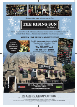 235 Stockport Road . Mossley . OL5 ORQ Tel: 01457 238 236 www.risingsunmossley.co.uk Richard & the team welcome you to the... Great selection of beers & ciders as well as our own selection of craft beer brewed exclusively in-house... There really is no better view to enjoy a pint! WEEKLY LIVE MUSIC AND LIVE SPORT Freshly homemade pizzas available Thursday, Friday & Saturday 6 - 9pm Sunday 4 - 7.30pm The BIGGEST and The BEST 14” pizzas made with fresh in-house dough THE RISING SUN Top Mossley READERS COMPETITION For your chance to WIN 2 PIZZAS & BOTTLE of HOUSE WINE at the Rising Sun then simply answer the following question... Q: What ingredients would you fifind on a RISING SUN PIZZA? If you know the answer, then simply send it to paul@aroundsaddleworth.co.uk by FRIDAY 30 T ound S A D D L E W O R T H .co.uk www.A th NOVEMBER. Te er rm ms s & Aro & C Co o n n d d i it t i io o n ns s , , E E n n t t r r a an n t ts s m m u us s t t b be e1 1 8 8 o o r ro ov v e er r ! ! 15 Check out Facebook & Website for all Forthcoming events!