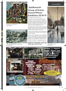 ‘Indian’s Head, Chew Valley.’ Oil. Sheila Dewsbury. Saddleworth Group of Artists Annual Winter Exhibition 2018/19 Running from Saturday 1st December 2018 early January 2019 Well known local artists will again be exhibiting their work. Always a popular show, especially in the run up to Christmas, the exhibition will be comprised of around fififty works, with styles ranging from photo realism to expressionistic. Most paintings will be on sale. The group, founded in 1950 by water colourist Ellis Shaw and friends, is currently comprised of around sixty enthusiastic members. Some are full time professionals but all are seriously committed to their work. So why not call in and take a look and possibly fifind that very special and unique Christmas present amongst the art works on display. Lottery funded refurbishment of the Saddleworth Museum in recent years has transformed the existing museum with improved access, enhanced displays and exhibitions and an engaging learning programme, all ensuring the museum’s future for many years to come.” Check out our website - www.saddleworthartists.co.uk Saddleworth Museum, High St, Uppermill, OL36HS Tel. 01457874093 Entry to the museum gallery is free of charge. Booth Wood Inn ‘View overlooking Delph, bleak midwinters day’. Oil. John McCombs ‘Albert Square. M2’. Oil. Jane Braithwaite FREE HOUSE Here at ThThe Booth Wood Inn, we have a fantastic range of delicious food available! Christmas MENU now available to view online... OPEN ALL DAY Christmas Eve, Boxing Day & New Year’s Day! FULLY BOOKED New Year’s Eve Classic Retro Menu available..... FROM £5 Monday to Friday 12 - 2pm and 5 - 7pm Saturday 12 - 4.30pm SUNDAY LUNCHES Available ALL DAY (12 - 8pm) Telephone: 01422 825600 Oldham Road, Rishworth, Halifax, West Yorkshire, HX6 4QU. www.theboothwoodinn.co.uk from telephone oror go to our website... £9.95 www.AroundSADDLEWORTH.co.uk 19 THE Out and about STEAK DEAL FROM £30 Two Steaks with ALL the trimmings Plus bottle of house wine To book a table please WE’RE IN IT! Get your copy of the Good Beer Guide 2018 w w w. w camrat.ordg.auyk/gbg w w .