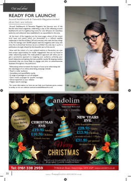 Out and about READY FOR LAUNCH! Around Saddleworth & Tameside Magazine excited about their new website Around Saddleworth & Tameside Magazine has become one of the Norths best-loved magazines, celebrating a way of life reflflecting around Saddleworth and it’s neighbouring towns for over 28 years. It’s matchless authority and editorials have established it as unparalleled in the area. At the heart of the magazine are the news pages, where all the recent local news and events which are showcased to a refifined, wealthy readership in the North West, UK and overseas, who seek the best things in life. On average over 30,000 people read the magazine each issue, and since the re-brand last Summer, we are confifident the only way is up for a publication strongly infused by this beautiful part of the world. Now with the advent of a new updated website in November, we now have unique opportunities for reader engagement that are not found in other advertising media.This multi-platform approach will allow you to give a productive approach to targeting your audience, achieving your brand objectives and getting the best possible results. By keeping readers interested, they are more likely to engage and click on advertisements displayed throughout the publication. Advertising online increases the impact of your print advertising and the advantages of an online advertising campaign include: • Reach a wider audience • Immediate and quantififiable results • A range of packages to suit all budgets • Tailor–made campaigns for specifific messages • Direct hyperlink to your website • Higher search rankings For more information on how we can help your business grow, contact us today on via our website www.aroundsaddleworth.co.uk CHRISTMAS EVE £19.95 Adults £10.95 Children Available from 5pm NEW YEARS EVE with live entertainment £28.95 Adults £13.95 Children (Available between 5 - 7.30pm) £31.95 per person (Available 7.30 - late) 20 www.AroundSADDLEWORTH.co.uk Christmas Bookings Now Being Taken