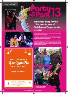 Party in the Park Rain stays away for the 13th year for one of Saddleworth’s spectacular events! Favourable Saddleworth weather was the order of the day as 1,200 revellers enjoyed an afternoon and evening of merriment at Delph’s annual Party in the Park knees up. Once again this fabulous event was held at Delph & Dobcross Cricket Club, and this was surely one of the best that the organisers had seen since they started back in 2005. The line up this year was again fifirst class with the likes of Queen tribute band, Mercury, Malcolm Pitt with the magical sounds of Lionel Ritchie and Danny Lowrie, who is regarded as the best Robbie Williams tribute act in the country, as well as Ska Britannia and top local bands Flatline and Neon. SANTA’S WORKSHOP N ew Year’s Eve WORKSHOP BALL £66.00 PER ADULT SMOKIES PARK HOTEL Ashton Road, Bardsley, Oldham OL8 3HX 0161 785 5000 sales@smokies.co.uk | www.smokies.co.uk Images on pages 24 and 25 are courtesy of Stuart Colman 22 www.AroundSADDLEWORTH.co.uk