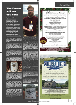The Doctor will see you now! By Alistair Cochrane Alexander Smalley, Saddleworth’s Very Own Master Distiller. The Creator of the Doctor’s Favorite Gin says there’s much more to come from the Saddleworth Distillery. In only six months, the Doctor’s Favorite has spread to bars and pubs around Saddleworth and its neighbouring areas of Tameside and the Tame Valley. The brain behind Saddleworth Distillery, Alexander Smalley, says that the Doctor’s Favorite gin can go even further: “Doctor’s was made to expand, what I’m looking to do is start it local in order to gauge the reception, and so far, it has been phenomenal. Local businesses have been really supportive as well.” While the expansion of Saddleworth distillery into a nationally sold gin, is the ultimate goal for Smalley, the mindset of local businesses helping each other out will be key to the distillery’s success. Smalley also describes himself as a mad scientist, and claims that he sees the potential for new flflavours everywhere: “I get in a mindset when I’m walking down the aisle of a supermarket and see some unique botanicals or fruits and it gets me thinking about how I can use it? I’m seeingthepotentialforgineverywhere. “It’s getting to be an issue because I want to try so much but I have to reign myself in.” It isn’t just random experimentation at Saddleworth Distillery though, Smalley has a Masters in chemical biology from the Imperial college in London. The Distiller then went on to explain that while the ideas for flflavours are purely creative, there is a huge need for his scientifific knowledge when extracting STARTERS Homemade French onion soup served with cheesey crouton Homemade chicken liver pate and brown toast Homemade brushetta - a toasted ciabatta topped with diced tomatoes, cucumber, red onion & peppers marinated in garlic & basil olive oil (vegan & vegetarian) MAINS Traditional roast turkey served with all the trimmings Tuna steak marinated in ginger, garlic & soy sauce served on a bed of spring onion mash with seasonal vegetables Homemade vegetable casserole & dumplings served with sauted potatoes and seasonal roasted vegetables cooked in a rich tomato sauce (vegan & vegetarian) DESSERTS Traditional Christmas pudding with brandy sauce Baked pineapple caramelised with cinnamon & sugar with vanilla ice cream Homemade pear & cranberry crumble served with custard 3 Courses £19.95 CThe Chur 2 Courses £15.95 This is even true to the extent that Smalley has teamed up with a local pub in order to create a bespoke gin, that the flflavours into his gin: “My scientifific represents the area in the best possible Christmas Menu back ground really comes in when I’m Available 1st - 31st DecembsecralCinhgriisttmuaps wDiatyh CflflLowOSrEaDtes of the Monday to Thursday 12.00v-a3p.o0u0rpsm, and 5t.e0m0pteor9a.t0u0rpesm and Friday,Saturday&Scuondcaenyt1ra2t.0io0n-s.9.00pItm’s all about consistency, and I went into it with that 3 Courses £18.95 2 Courses £13.95 mindset of knowing every aspect of Tel: 0145w7h8at2I0w9a0s 2doing.” STARTERS Homemade French onion soup served with cheesey crouton So, there will be plenty to look out for in the future from Saddleworth’s master gin craftsman.The operation is Homemade chicken liver pate and brown toast sure to expand as Smalley says that he way. GinSun, cHreoamteedmbaydSembarlulesyh, efottrat-hea toasisteldoocikaibnagttfoa rtobpipggeedrwpirthemdiscesd in which Rising Sun FreetomHaotouesse, cuincuMmobsesr,lerye,d ontioncr&eapteppmeorsremagrininsataendinyet another utilises the flflavour of Wgarimlicbe&rrbiaesiltohlaitve oilo(cvaelgaenxp&ovrtegtehtatriaSnad) dleworth can be Smalley picks from the Saddleworth proud of. moors himself. Smalley says “that the MAINS Traditional roast turkey served with all the trimmings gin suits the ethos of the place really well.” To learn more about the Doctor’s Tuna steak marinated inFgaivnogreitre, ganrldicA&lesxo’sy seaxupceerimental new wonderfully tropical, fruit flflavour to the elderflflower tonic, then it might served on a bedgionfsspforilnlogwonSioanddleworth distillery on The GinSun also combines the flflavour Facebook, Twitter or Instagram to see elderflflower tonic, brings out a mash with seasonal vegetables of Anise, which when mixed with regular post updates. Homemade vegetable casserole & dumplings served with sauted potatoes and seasonal roasted gin. Smalley 2says that the mixer for a gin (vegan & vegetarian) is vital to bringing out the best flflavours possible: £15.95 Traditional Christmas pudding “Doctor’s Favorite gin has a very light and aromatic flflavour. If you used vegetables cooked in a rich tomato sauce Courses DESSERTS with brandy sauce Baked pineapple caramelised with cinnamon & sugar with vanilla ice cream overpower it and change the dynamic Homemade pear & cranberry crumble served with custard for the worse because it’s not sweet. My Gin should be green, peppery and Available 1st - 31 December (Closed Christmas Day) Monday to earthy almost, so you want to embrace that with a light tonic.” Thursday (12 noon - 3pm & 5pm - 9pm) Friday, Saturday & Sunday (12 noon - 9pm) 3 Courses £19.95 Christmas Menu Available 1st - 31st December Christmas Day CLOSED Monday to Thursday 12.00 - 3.00pm and 5.00 to 9.00pm Friday, Saturday & Sunday 12.00 - 9.00pm 3 Courses £18.95 2 Courses £13.95 www.AroundSADDLEWORTH.co.uk 13 www.AroundSADDLEWORTH.co.uk Tel: 01457 820 902 Available 1st - 31 December (Closed Christmas Day) Monday to Thursday (12 noon - 3pm & 5pm - 9pm) Friday, Saturday & Sunday (12 noon - 9pm) 1 Out and About Church and pub oftften sit well together and in Saddleworth, debatable land betwtween Yorkshire and Lancashire, the majestitic neo-Gothic St Chad’s Church and the sturdy Church Inn form a magnifificent duo at the head of a green and wooded steep valley looking down on the village of Uppermill. GREAT VALUE FAMILY MENU At the Church Inn we have two dining areas, our 