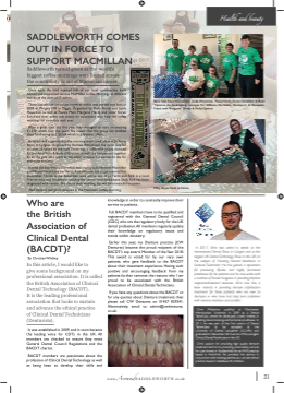 SADDLEWORTH COMES OUT IN FORCE TO SUPPORT MACMILLAN Saddleworth turned green as the world’s biggest coffffee mornings were hosted across the community in aid of Macmillan cancer. Once again the kind hearted folk of our local communities both hosted and supported various MacMillan Coffee Mornings at different venues at the start of October. These included an annual get together which was started way back in 2005 at Wrigley Mill in Diggle. Organised by Paula Hardy and Linda Heywood, as well as Paula’s Mum Margaret Hardy and sister Karen Schofifield, their event rely totally on volunteers who help the coffee morning run smoothly each year. After a great turn out this year, they managed to raise an amazing £1,370 which over the years has meant that the group has totalled their fundraising to £18,934 which is a fantastic effort. Another well supported coffee morning event took place at Jo Ferns Salon in Lydgate. Organised by Rachael Whitehead, the salon was full of cakes all baked by the staff.There was a rafflfle with prizes donated by the like of Face & Body of Grotton, as well as a hamper put together by all the girls who work at the salon to make it a successful day for everyone involved. In total the day raised £500 which was equally split between Macmillan and Nicola Gerard and her fifiancéé Rick who are due to get married this December. Nicola is the beautician who works out of Jo Ferns and Rick is a local fifireman who was involved in tackling the recent moorland blazes. Sadly, Rick has been diagnosed with cancer. No doubt their wedding day will be a beautiful occasion. Well done to everyone involved in the Macmillan coffee morning. Back row: Stuart Schofifield, Linda Heywood, Paula Hardy, Karen Schofifield & Rose Tipton.is the fundraising manager for Oldham, Rochdale, Stockport & Tameside. Front row. Margaret Hardy & Holly Spence Milly Heyes from Jo Ferns. Who are the British Association of Clinical Dental (BACDT)? By Christian Wibbley In this article, I would like to give some background on my professional association. It is called the British Association of Clinical Dental Technology (BACDT). It is the leading professional association that looks to sustain and advance the ethical practice of Clinical Dental Technicians (Denturists). It was established in 2009, and it soon became the leading voice for CDTs in the UK. All members are checked to ensure they meet General Dental Council Regulations and the BACDT charter. BACDT members are passionate about the profession of Clinical Dental Technology as well as being keen to develop their skills and knowledge in order to constantly improve their service to patients. Full BACDT members have to be qualifified and registered with the General Dental Council (GDC) who are the regulatory body for the UK dental profession.All members regularly update their knowledge on regulatory issues and trends within dentistry. Earlier this year, my Denture practice (CW Dentures) became the proud recipient of the BACDT’s top award, Member of the Year 2018. This award is voted for by our very own patients, who gave feedback to the BACDT about their treatment experience. Having such positive and encouraging feedback from my patients further cements the reasons why I am proud to be associated with the British Association of Clinical Dental Technicians. If you have any questions about the BACDT or for any queries about Denture treatment, then please call CW Dentures on 01457 829241. Alternatively, email us admin@cwdentures. co.uk. In 2017, Chris was asked to speak at the International Dental Show in Cologne and at the largest UK Dental Technology Show in the UK on the subject of ‘Creating Natural Aesthetics in Denture Treatment’. He has gained a reputation for producing life-like and highly functional prostheses for his patients and he now works with a number of Dental Surgeons in providing Implant supported/retained dentures. Chris now has a keen interest in providing denture stabilisation treatment for those patients who are new to dentures or who have had long term problems with denture retention and comfort. Chris Wibberley qualifified at Manchester Metropolitan University in 2009 as a Dental Technician, where he developed a keen interest in creating natural looking and functional prostheses. In 2011, he was part of the fifirst cohort of Dental Technicians to be accepted at the University of Central Lancashire (UCLAN) and graduated in December 2013 as one of the youngest Clinical DentalTechnicians in the UK. Chris’ passion for providing high quality denture treatment led him to providing a domiciliary service for care homes in Huddersfifield for an NHS practice based in Holmfifirth. He provided this service in conjunction with treating patients at a private dental practice based in Saddleworth, Oldham. www.AroundSADDLEWORTH.co.uk 31 Health and beauty