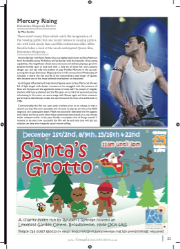 Mercury Rising Bohemian Rhapsody Review By Mike Kemble There aren’t many fifilms which catch the imagination of the viewing public but one recent release is causing quite a stir with both music fans and fifilm enthusiasts alike. Mike Kemble takes a look at the much anticipated Queen fifilm, Bohemian Rhapsody.... Anyone familiar with Rami Malek, who is probably best known as Elliot Alderson from the Netflflix series Mr. Robot, will be familiar with the intensity of has acting capabilities. His magnifificent cheek-bone structure and athletic physique give him another-worldly type of look and with a little bit of facial hair and costume design, you can see why he’s perfect to play Freddie Mercury in the up-and- coming fifilm biopic Bohemian Rhapsody. Out in UK cinemas from Wednesday 24 October, it charts the rise and life of the extraordinary lead singer of Queen, who became one of the most beloved entertainers on the planet. As all hugely inflfluential and inspirational fifigures seem to face, Mercury’s life was full of light tinged with darker moments as he struggled with the pressure of fame and fortune and the egotistical sense of one’s self. His pursuit of singular stardom didn’t go as planned and the fifilm goes on to chart his personal journey culminating in his return to centre-stage with Queen again and their meteoric performance that literally rocked the world around the time of Live Aid, back in 1985. Controversially, the fifilm has seen early criticism prior to its release in that it doesn’t portray Mercury’s sexuality and chooses to play lip service to his AIDS diagnosis and subsequent death. Malek has staunchly defended the fifilm against such claims and has a point when these sentiments were based on a one-minute trailer released earlier in the year. Hardly a complete view of things overall. It remains to be seen how successful the fifilm will be and only time will tell, but nobody can deny this rhapsodic story’s worth telling. December 1st/2nd, 8/9th, 15/16th & 22nd tickets Santa’s £5 Santa’s 11am until 3pm includes a gift! Please call 01457 680023 or email enquiries@reubensretreat.org No pre-bookings required Grotto Grotto . . . . . . . . . . . . . . . . . . . . . . . . . . . . . . . . . . . .. . . . . . . . . . . . . . . . . . . . . . . . . .. . . . . ... . . . . . . . . . . . . . A charity event run by Reub b e en’ t Lymefifield Garden Centre, Broadbottom, Hyde SK14 6AG ’s R Retreat www.AroundSADDLEWORTH.co.uk CMYK t h ho o s s s t t t t ed at 35
