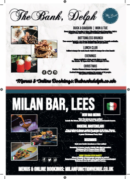 TheBank, Delph DUCK & DAIQUIRI | mon & tue Every Monday & Tuesday 4-9pm | Shredded Duck & Pancakes, Salt & Pepper Fries and Two Daiquiri Cocktails | £29.50 for Two Bottomless bRUNCH Two-course brunch + two hours bottomless Prosecco, brunch cocktails, draught beer & soft drinks | £26.00 per person LUNCH CLUB Collect stamps for each lunch visit! 10 stamps for a free lunch! EVENINGs Menu available 4-9pm seven days a week. Bar drinks 'til 11pm Sun-Thu & Midnight Fri-Sat. CHRISTMAS Festive-Themed Menus throughout December! Cocktail Masterclass sessions for groups of 10 people. The perfect Christmas outing! Menus & Online Bookings: thebankdelph.co.uk MILAN BAR, LEES `new bar menus View the latest menus online! Lunch Set Menu, Evening Bar Menu, Bottomless Lunch & more. COCKTAIL MASTERCLASS Fun & informal classes perfect for groups of all sizes. Classes include three cocktails and food packages can be added on too. A great Christmas Party idea! DECEMBER Grab your festive brochure or view online! December 3-Course Lunch | £15.00 | 5th-23rd December. Christmas Eve 3-Course Menu | £22.50 New Years Eve 3-Course Lunch | 12-5pm NEW YEARS EVE PARTY Glass of bubbly & homemade canapéés on arrival. Entertainment through the night, plus bacon butties at midnight! Tickets are now on sale! £25 Per Person. MENUS & ONLINE BOOKINGS: MILANFUNCTIONVENUE.CO.UK www.AroundSADDLEWORTH.co.uk 5