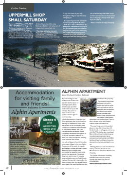 Festive Feature UPPERMILL SHOP SMALL SATURDAY so pop in to each on your way through the village to see what they have going on. By supporting your local businesses you’re supporting PASSION, SKILL, CREATIVITY and COMMUNITY! By gifting from independents not only do you get something that will make the recipient feel great you’re also buying into a small business keeping those businesses going and maintaining a local high street fifilled with an eclectic mix of fantastically ORIGINAL shops and bars and eateries too because let’s face it shopping is thirsty work! (See Pg 61 for advert) Merry Christmas & Happy Shopping! Come to UPPERMILL on SATURDAY 10TH NOVEMBER for a village wide Christmas shopping event. Shop your local INDEPENDENTS for unique Christmas gifts you won’t fifind in the major high streets stores. Get inspired, place your Christmas orders, bookings and appointments before the rush. Eat, drink and be merry at the many fabulous caféé’s, bars and restaurants all independently owned and run. The village will be bursting with PROMOTIONS, COMPETITIONS, GIVEAWAYS and FREEBIES each business celebrating in their own way Accommodation ALPHIN APARTMENT for visiting family Your Perfect Festive Retreat If you’re looking to visit Saddleworth and the local area this festive season or starting to panic about where to put up loved ones in the run up to the holidays, then panic no more as there is the perfect solution right on your doorstep. Alphin Apartment is a beautiful fifirst flfloor apartment that can be found on the edge of Saddleworth Moor with easy access to the surrounding area. Located in a converted barn attached to the friendly owners’ mid 19th century Pennine farmhouse, it was completely refurbished throughout in 2018 with wonderful attention to detail, and offers beautiful far reaching views towards Pots & Pans. As well as Uppermill and all the other picturesque villages in the area,Alphin Apartment will certainly be popular with walkers, cyclists and nature lovers alike with the immediate area surrounded by beautiful countryside such as the spectacular Dovestone Reservoir which is just 10 minutes away, and backs onto the Peak District National Park and all it has to offer. For those bringing their four-legged friends, warm water dog wash facilities are also provided at the property. The property boasts two bedrooms, one with a double bed and the other with twin beds, as well as beautifully laid out kitchen and dining room which comes complete with electric oven, induction hob, microwave, fridge/freezer, dishwasher and washer/dryer.There is also a shower room with heated cubicle, toilet and heated rail. The cosy living room is the perfect place to relax after a busy day with family. friends or colleagues, and comes with Sky TV(including sports package) Both child and dog friendly, this great moorland apartment also has an enclosed courtyard garden with BBQ facilities (if you’re willing to brave the elements) and private parking for one car. Walking distance to the Trans Pennine railway network, 20 minutes into Manchester for Christmas Markets and shopping. For further information, including available dates over the coming months, the please ring Pam on 07949835364. www.alphinapartment.com and friends! welcome to Alphin Apartments Sleeps 4 and welcomes dogs and children. 60 www.AroundSADDLEWORTH.co.uk a newly refurbished holiday apartment on the edge of Saddleworth Moor, within walking distance of Uppermill, the TransPennine train line and the Hudders- fifield canal. 07949 835 364 Contact Pam for availability and prices on www.alphinapartment.com