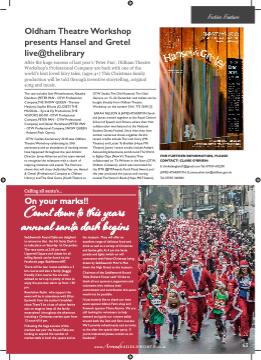 Oldham Theatre Workshop presents Hansel and Gretel live@thelibrary After the huge success of last year’s ‘Peter Pan’, Oldham Theatre Workshop’s Professional Company are back with one of the world’s best loved fairy tales. (ages 4+) This Christmas family production will be told through inventive storytelling, original song and music. The cast includes Sam Winterbottom, Natasha Davidson (PETER PAN - OTW Professional Company,THE SNOW QUEEN - Theresa Heskins), Sophie Ellicott (CLOSETS THE MUSICAL - Eyre & Ely Productions,THE VISITOR’S BOOK -OTW Professional Company, PETER PAN - OTW Professional Company) and Daniel Hartshead (PETER PAN - OTW Professional Company, SNOW QUEEN - Relative Pitch Opera). OTW Golden Anniversary 2018 sees Oldham Theatre Workshop celebrating its 50th anniversary, and an abundance of exciting events have happened throughout the year.Artistic Director James Atherton and his team wanted to recognise the milestone with a clutch of inspiring initiatives and events.The fifinal two shows that will close theGolden Year are Hansel & Gretel (Professional Company at Oldham Library) and The Glad Game (Youth Theatre at OTW Studio,The Old Museum).The Glad Game is on 15–22 December and tickets can be bought directly from Oldham Theatre Workshop on the number 0161 772 3240 [1]. SARAH NELSON & JAMES ATHERTON Sarah and James trained together at the Royal Central School of Speech and Drama, where their fifirst collaboration was featured at the National Student Drama Festival. Since then, they have written numerous shows together. Sarah’s recent credits include The Lost Story (M6 Theatre) and Letter To Boddah (Hope Mill Theatre). James’ recent credits include Astley’s Astounding Adventures and Around The World in Eighty Days (New Vic Theatre).They collaborated on ‘Tis Written in the Stars (OTW, Oldham Coliseum), which was nominated for the MTA @MTAwards Youth Panel Award, and this year produced the joyous and moving musical The Visitor’s Book (Hope Mill Theatre). FOR FURTHER INFORMATION, PLEASE CONTACT: CLARE O’BRIEN: E: thinkofengland1@gmail.com Tel: 07939 692200 JAMES ATHERTON: E: james.atherton@oldham.gov.uk Tel: 07595 300384 Festive Feature Calling all santa’s......... Saddleworth Round Table are delighted the museum. They will offer an On your marks!! Count down to ththis years annual santa dash begins to announce that the 4th Santa Dash is to take place on Saturday 1st December. The race starts at 2.30 pm near Uppermill Square and tickets for all willing Santa’s can be found via the Facebook page /SaddleworthRT. There will be two routes available, a 5 km course and also a family (buggy) friendly 2 km course.You are also advised to turn up in plenty of time to enjoy the pre-race warm up from 1.30 pm. Revolution Radio who support the event will be in attendance with Elliot Eastwick from the station’s breakfast show.There’ll be a lots of other festive acts on stage to keep all the family entertained throughout the afternoon including a Christmas market open from 12 noon till 6 pm. Following the huge success of the markets last year the Round Table are looking to expand the number of market stalls in both the square and at excellent range of delicious food and drink as well as a variety of Christmas and festive gifts.At 4 pm the Santa parade and lights switch on will commence with FatherChristmas being drawn by Saddleworth Morris Men down the High Street to the museum. Chairman of the Saddleworth Round Table Richard Foster said:“I’d like to thank all our sponsors, supporters and volunteers who without their commitment and contribution this event would not be possible. I’d particularly like to thank our main event sponsor Albion Farm shop and fifirework sponsor Mono Alarms. We are still looking for volunteers to help steward and guide our runners safely around both the 2km and 5km courses. We’ll provide refreshments and an invite to the after the special after party. If you’re interested please contact us via facebook.” w w w w w . Aw . A r o r u o n u d n S d A S D A D D L D E 63 L EW O R T H . c o .uk W OR T H . co . u k