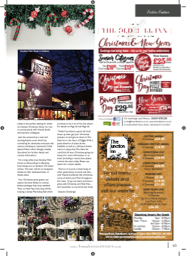 Smokies Park Hotel in Oldham makes it the perfect setting for either an intimate Christmas dinner for two or private party with friends, family and business colleagues. Jean has conjured up a new and exciting festive menu which has something for absolutely everyone this season, including an impressive Chefs Special Menu which changes weekly. See advert for further details and contact information. For a long while now, Smokies Park Hotel on Ashton Road in Bardsley have always put on fantastic Christmas events. This year will be no exception thanks to their dedicated team of Santas elves. Your Christmas party guests can expect the best thanks to various festive packages they have available. Then on NewYears Eve they will be hosting a Santas Workshop Ball which The Junction Inn, Hazelhurst promises to be a lot of fun. See advert for details on Page 22 and Page 64. Finally if you fancy a good old local knees up, then get your Christmas jumpers on and get on down to The Gate Inn in the heart of Diggle.With a great selection of party drinks available, as well as a delicious festive menu to enjoy, then The Gate Inn could tick all your Christmas going out boxes. For more information or to book (including a room), then please contact the team today. Please see advert for contact details. There is of course a whole heap of other great places to party and dine with friends and family this Christmas, some of which you’ll fifind throughout this issue. So go out there and have a great, safe Christmas and New Year.... and remember to not drink and drive! Seasons Greetings! AA Rosette Award for Culinary Excellence Smokies Park Hotel in Oldham Bookings now being taken - Join us for your festive celebrations Senior Citizens and for those with a smaller appetite www.AroundSADDLEWORTH.co.uk 65 Find us on Facebook £10 £13 Restaurant and Brasserie MenuServed all day Noon to 9.30pm Served Noon -7pm Two .95 Three .50 Courses £29.95 For full men 5 Courses £54.95 FULLY BOOKED Courses Three Courses Dine,Partyand FiveCourses u details and BOXING DAY offers please visit our website 1 Course £7.95 2 Courses £14.95 3 Courses £21.95 NEW YEARS EVE (Booking Essential) 5 Courses Fizz on arrival & midnight nu Festive Feature £74 7.30pm arrival - 8pm Dine For bookings and Menus: 01457 870130 e:info@theoldbellinn.co.uk www.theoldbellinn.co.uk 5 Huddersfifield Road, Delph, Saddleworth OL3 5EG Three Courses £25.95 Available from Monday 1st December - Sunday 23rd December SORRY, Cancellation Festive Party Menu Christmas Eve Boxing Day Christmas Day FULLY BOOKED list in place BOOKING ESSENTIAL welcome in .95 the New Year withourDJ. ServedNoon-7pm FESTIVE MENU 4 Courses £24.95 SENIORS FESTIVE MENU CHRISTMAS EVE 4 Courses £14.95 (Booking Essential) 4 Courses £34.95 CHRISTMAS DAY Live Music with ACK BARCLAY & Disco Opening hours for food: J A J £54.95 Monday: Tues - Thurs Fri and Sat: Sunday: 5pm - 8.30pm 12noon - 2.30pm and 5pm - 8.30pm 12noon - 8.30pm 12noon - 7.30pm Mossley Road, Hazelhurst, Ashton-U-Lyne. OL6 9DX 0161 343 4831 www.robinsonbrewery.com/junctionhazelhurst PERPERSON