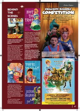 eabtouuret EXCLUSIVE READERS COMPETITION For your chance to WIN a FAMILY TICKET to one of the JACK IN THE BEANSTALK dates between 15th December - NEW YEARS EVE the simply send O F d A u es t a ti v n BEHIND THE SCENES e F us your best (Clean) PANTO JOKE and we’ll pick out the funniest! It takes a lot of work to put on a panto, and the team have been hard at work since January. The fifirst job to be done is writing the script. “The fifirst read through was February 1st,” says writer Ben Richards. “We have to have the script very early on so we know what costumes need to be made, what set needs to be built and how many actors we need. Of course, there will always be more to add: topical jokes and this year’s chart toppers for starters, so the fifinal version of the script gets sent out in the last week of November.” Dame Trott, explains: “The cast line-up is fantastic. We’ve got a really talented bunch who are coming from TV and the West End stage. I love Saddleworth and am really looking forward to playing The Millgate this year. We have a ball at Christmas - the audience always gets involved, singing and laughing along.” Jack and the Beanstalk is playing from the 15th of December right up to New Year’s Eve. Tickets are selling well with several dates sold out already, so if you want to make sure you get yours in time, visit the Saddleworth Live webpage at: www.saddleworthlive.com/ panto or call box offifice on: 01457 874644 The Closing date for the competition will be FRIDAY 30th NOVEMBER, so please send in your entries to paul@aroundsaddleworth.co.uk along with your contact details by this date for your chance to WIN an evening of Festive family fun to remember! Best of Luck! “Costumes, props and set are another giant job,” says tech-expert Will Cousins. “Everything for the show gets built in our workshop in Sussex and shipped up in time for opening night. We have been working on the build full-time since July - I don’t want to give anything away, suffifice to say that we have been buying top notch pyrotechnics and glitter by the kilo.” No panto would be complete without a dame, and here in Saddleworth we’re lucky to have one of the best. Scott Worsfold, playing www.AroundSADDLEWORTH.co.uk 67 Tickets available at www.saddleworthlive/panto or Call the BOX OFFICE on: 01457 874644