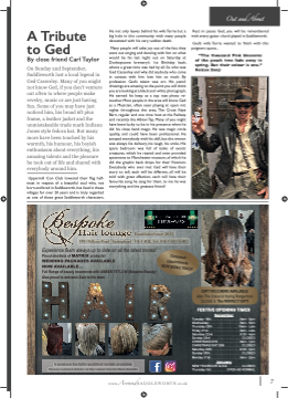 A Tribute to Ged By close friend Carl Taylor On Sunday 2nd September, Saddleworth lost a local legend in Ged Casserley. Many of you might not know Ged, if you don’t venture out often to where people make revelry, music or are just having fun. Some of you may have just noticed him, his broad 6ft plus frame, a leather jacket and the unmistakeable trade mark Indiana Jones style fedora hat. But many more have been touched by his warmth, his humour, his boyish enthusiasm about everything, his amazing talents and the pleasure he took out of life and shared with everybody around him. Uppermill Con Club lowered their flflag half- mast in respect of a beautiful soul who, not born and bred in Saddleworth, has lived in these villages for over 20 years and is truly regarded as one of those great Saddleworth characters. He not only leaves behind his wife Terrie but a big hole in this community with many people devastated with his very sudden death. Many people will take joy out of the fact they were out singing and dancing with him on what would be his last night out on Saturday at Donkeystone brewery’s 1st Birthday bash, where a great time was had by all. So who was Ged Casserley and why did anybody who came in contact with him love him so much. By profession Ged’s talent was art. His pencil drawings are amazing to the point you will think you are looking at a black and white photograph. He earned his keep as a top rate photo re- toucher. Most people in the area will know Ged as a Musician, often seen playing at open mic nights throughout the area, The Cross Keys Barn, regular and one time host at the Railway and recently the Albion Tap. Many of you might have been lucky to be in his presence when he did his close hand magic. He was magic circle quality, and could have been professional. He amazed everybody with his skill, but the winner was always his delivery, his laugh, his smile. His spare bedroom was full of tanks of exotic creatures, which he reared and even provided specimens to Manchester museum, of which he did the graphic back drops for their Vivarium. Everybody who ever met Ged will have their story to tell, each will be different, all will be told with great affection, each will have their favourite song he sang for them, to me he was everything and the greatest friend! Rest in peace Ged, you will be remembered with every guitar chord played in Saddleworth. Ged’s wife Terrie wanted to fifinish with this poignant quote... “The thousand Pink blossoms of the peach tree fade away in spring. But their colour is one.” Keizan Zenji Established since 2015 189 Oldham Road . Springhead . OL4 4QJ. Tel: 0161 633 6487 Experience team always up to date on all the latest trends! Proud stockists of MATRIX products! WEDDING PACKAGES AVAILABLE NOW AVAILABLE... Full Range of beauty treatments with AMBER TETLOW (Bespoke Beauty) Also proud to welcome Zara to the team GIFT VOUCHERS AVAILABLE Also The Colour & Styling Range from CLOUD 9, The PERFECT GIFT! A position for fully qualifified stylish available. Please contact Adele at the salon for further details. FESTIVE OPENING TIMES December Tuesday 18th. . . . . . . . . . . . . . . . .9am - 5pm Wednesday . . . . . . . . . . . . . . . . . .9am - 5pm Thursday 20th . . . . . . . . . . . . . . .10am - Late Friday 21st. . . . . . . . . . . . . . . . . . .9am - Late Saturday 22nd . . . . . . . . . . . . . . . .8.30 - 4pm Sunday 23rd . . . . . . . . . . . . . . . . . .CLOSED CHRISTMAS EVE . . . . . . . . . . . . .9am - 1pm CHRISTMAS DAY 28th . . . . . . . . . .CLOSED Saturday 29th . . . . . . . . . . . . . . . .8.30 - 4pm Sunday 30th . . . . . . . . . . . . . . . . . .CLOSED Monday 31st . . . . . . . . . . . . . . . . .9am - 2pm January NEW YEARS DAY & 2nd. . . . . . . . .CLOSED Thursday 3rd . . . . . . . . . OPEN AS NORMAL www.AroundSADDLEWORTH.co.uk 7 Out and About Christmas appointments NOW BEING TAKEN