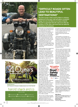 Business “DIFFICULT ROADS OFTEN LEAD TO BEAUTIFUL DESTINATIONS” The above quote is often used by bikers to celebrate getting out on the open road and paints a wonderful image, but even the bikers in our team at Harold Stock & Co appreciate that the road is not often the problem; it’s the other road users that can make the destination less attractive. John Byrne Legal Accounts Manager & Treasurer of National Association for Bikers with a Disability (NABD) Whilst bikers are not generally known to complain about the odd knock and the occasional bruise or graze, unfortunately, the shocking fifigures for last year show that more than 450 bikers ended up in our local hospitals. The NHS statistics have 75 going to Salford Royal Hospital (where they have a specialist head injury unit), 76 to hospitals under the Pennine Acute Hospital NHS Trust banner, 74 to central Manchester, 68 to south Manchester, 53 to Wrightington,Wigan and Leigh, 39 to hospitals in Bolton, 39 to Stockport and 25 to Tameside and Glossop Trust. Whilst the fifigures have dropped a bit in the wake of the “Think Bike” campaigns, this may be because more motor cyclists are taking advanced riding tests to protect themselves from others who might not see them on the road, or might not appreciate that braking on a motorbike does not happen quite as it does in a car. On top of the 319 bikers killed, there are over 5,500 seriously injured and over 13,000 who suffer minor injuries. We feel that something must be done about these fifigures.Whilst by the fault of another, rather than by the biker whose journey has taken him or her to hospital, rather than to the beautiful destination that was anticipated when they started their rideout. Unfortunately, our local papers are full of motor cyclists being left with life changing injuries when collisions have occurred, even on the less rural roads. We can’t prevent accidents happening but, in many cases, the term accident is misleading. If there is an element of fault on the part of the other driver, this is something we will investigate and discuss with you. We have recently represented a biker who was unfortunate enough to suffer a leg amputation whilst riding to work on our local roads.As is often the case, he was driving along the main road and the car driver came out of a side road. Responsibility was initially disputed but, with engineering evidence and detailed witness statements, a large payment on account was obtained to get our client the adapted accommodation that he needed, the prosthetics assistance and Rooted in the community Mossley Branch 55-57 Stamford St, Mossley | info@haroldstock.com | 01457 835 597 members won the argument about spending part of the settlement on a new bike, and adapted prosthetics to allow him to ride again is still unclear! If you or a family member has been unfortunate enough to have seen the darker side of motorbike riding, whether you have Solicitors or not, there is nothing lost by giving us a call for a chat. John Byrne Legal Accounts Manager & Treasurer of National Association for Bikers with a Disability (NABD) Kirsty Dunn Chartered Legal Executive. harold st Moss_80x100.indd 1 ck and co 72 www.AroundSADDLEWORTH.co.uk 20/06/2018 14:12 in the 40 years that Harold Stock & Co have been helping local people with all aspects of the law, our serious injury team appreciates that bikers are fed up with car drivers suggesting that they “came from nowhere” and were “riding like a bat out of hell”. In the many claims that we have dealt with, some of which have been rejected by other less specialist teams, the patterns repeat themselves and there are suggestions that bikers should stick to the side of the road, should have braked more quickly (without the inevitable stoppie or lowside) or should not be fifiltering (which is legal). Despite the fact that you have dipped headlights, a loud can and a helmet brighter than Rossi’s, to make sure you are as visible as possible. We are used to working out speeds of impact, preparing site line diagrams, organising reconstructions and gathering the evidence necessary to prove that a collision has been caused We’re getting involved in the psychological help that allowed him to maintain contact with his family and his young children and to get back to a different, but as fulfifilling a life, as before the crash. His fifinal settlement was a substantial seven fifigure sum that, with appropriate fifinancial advice, should secure his future.Whether he or other family Road Safety Week 19-25 November 2018 Coordinated by Brake the road safety charity Sponsored by