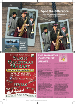 Kiidss Answers to last issues Spot the difference THE SAMANTHA JONES TRUST UPDATE TSJT, Saddleworth based children’s leukaemia charity, receive regular requests for help from children and their families from across the North west for treats, wishes and equipment to make life with leukaemia easier. Here’s a taster of what the team have been up to... TSJT SUNDAY INDOOR MARKETS The 2018 Markets are going from strength to strength and enabling us to fund raise to provide vital funds to help TSJT to fulfifil requests for help and support to local children with Leukaemia. The TSJT Markets feature ALL NEW products and continue to evolve and feature a variety of new stalls each month, including regulars selling cosmetics and body products, clothes, accessories, crafts, toy and book stalls along with more food produce and home ware on offer.There is also a pop up nail and brow bar! TSJT raises funds on the day by running its caféé for hot breakfast and lunches as well as a fabulous themed cake stall and tombola stall which is enabling the Trust to continue its important work.TSJT have received positive feedback from stall holders and members of the public who have loyally supported the market since its inception. For its continued success,TSJT needs the support of local people to come and enjoy the markets and help to raise funds. DATES FOR 2018 INDOOR MARKETS Sunday 18th November Sunday 9th December All 10am to 3pm, free entry and free parking.The market will also continue in 2019 with dates to be released in January. TSJT have been the chosen charity of the year for The Woman of Oldham and the team attended the annual fundraising lunch on 26th September. Natalie Daniels from the charity said “It is a privilege and an honour to secure the support of The Woman of Oldham and help us to continue the local work we do with children and families affected by Leukaemia.” FOR MORE INFORMATION, PLEASE VISIT THE WEBSITE AT www.thesamanthajonestrust.com YOU CAN ALSO FOLLOW TSJT ON TWITTER AND FACEBOOK OR JUST CONTACT BY TELEPHONE ON 01457 829479 IF YOU WOULD LIKE TO HELP AND SUPPORT TSJT. Where am I? Spot the difference Can you spot the 7 differences in these two images. 8080 wwww.A.ArroouunnddSSAADDDDLLEEWOORRTTHH.c.oc.ou.ukk