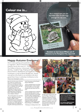 Colour me in... Set in tranquil spot, you can fifind these little wooden bugs amongst the real ones. Happy Autumn Everyone! Here’s some exciting and wonderful news...We co-organized “Moove And Groove Festival “ with Danielle Carroll who runs D.C. Fitness. Held at The Oddies in Royton, it showcased Dancing, Line dancing , Laughter Yoga, Singing and Signing, Funky Fitness Session, Mindfulness and Emotional Freedom Techniques, as well as Mixed Martial Arts. Awards were given at the fifinale to our members who have gained their Dance Leadership Certifification in the Dance by Example course. Out a Kids K nd id A s bout Answers to last issues Where am I? Milestone by the Navigation Pub, Uppermill Spurred on by the success of the last two months we continued to go within our community as we have done in the past, taking the things we learn to residential care homes with the emphasis on fifitness and mindfulness.This time we visited Holland Close in Delph delivering our Well-being sessions including Fun Dance routines, Sing and sign and some meditation methods. We are being asked more and more by other organizations including Oldham College to deliver presentations to promote the good stuff we do at Funky, spreading the word about our Holistic approach to self-improvement and independent living.Also delivering presentations at Social Care groups and the People’s Museum Manchester. We are looking forward to the Santa Dash! And hope to involve members and their families as we thoroughly enjoyed it last year. Santa suits are a must. We are looking forward to delivering dance by example sessions in local schools and residential homes.Dragon Arts (who deliver amazing sessions) want to work with local groups like us and residential homes delivering sessions focusing on improving emotional, mental and physical wellbeing. For further details contact Richard kirkham on 07729476952. Following our amazing success at the George Lawton Hall we had a visit from the Mayor of Mossley Irene Raddings and Mayoress Christine Lyness who joined us for a healthy lunch and participated in our fifitness, signing and meditation session.We have even been booked for their Christmas event on Friday 14th December 2018. www.AroundSADDLEWORTH.co.uk 81 www.AroundSADDLEWORTH.co.uk We are more than happy to put on shows to entertain you. Our sessions improve wellbeing, mind, body and spirit, as well as bringing fun to everyone. For further details contact Carita on 07706 709492 81 Have you seen this scene on your walks