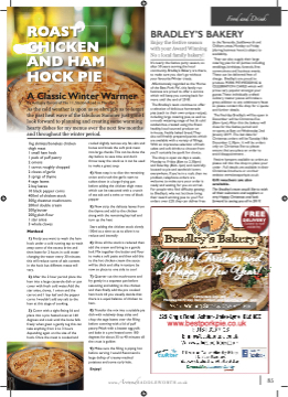 ROAST CHICKEN AND HAM HOCK PIE A Classic Winter Warmer By Anthony Byrom of No 11, Station Road in Marsden As the cold weather is upon us so abruptly as to forget the past heat wave of the fabulous Summer just gone I look forward to planning and creating some warming hearty dishes for my menus over the next few months and throughout the winter period. BRADLEY’S BAKERY 1kg skinless/boneless chicken thigh meat 1 small ham hock 1 pack of puff pastry 2 onions 1 carrot roughly chopped 2 cloves of garlic 3 sprigs of thyme 4 sage leaves 2 bay leaves 10 black pepper corns 400ml of chicken stock 300g chestnut mushrooms 200ml double cream 200g butter 200g plain flflour 1 star anise 3 whole cloves Method 1) Firstly you want to wash the ham hock under a cold running tap to wash away some of the excess brine and then leave for 2 hours in cold water changing the water every 30 minutes this will reduce some of salt content in the hock but different meats will vary. 2) After the 2 hour period place the ham into a large casserole dish or pan cover with fresh cold water.Add the star anise, cloves, 1 onion and the carrot and 1 bay leaf and the pepper corns I wouldn’t add any salt to the ham at this stage of cooking. 3) Cover with a tight fifitting lid and place into a pre heated oven at 160 degrees and cook until the bone falls freely when given a gently tug this can take anything from 2 to 3 hours depending again on the size of the hock. Once the meat is cooked and cooled slightly remove any fat, skin and bones and break the soft pink meat into large chunks.This can be done the day before to save time and don’t throw away the stock as it can be used to make a great soup 4) Next step is to dice the remaining onion and crush the garlic start to soften them in a large frying pan before adding the chicken thigh meat which can be seasoned with a crunch of sea salt and a twist or two of black pepper 5) Now strip the delicate leaves from the thyme and add to the chicken along with the remaining bay leaf and turn up the heat Start adding the chicken stock slowly 100ml at a time so as to allow it to reduce and intensify 6) Once all the stock is reduced then add the cream and bring to a gentle boil. Mix together the butter and flflour to make a soft paste and then add this to the hot chicken cream the sauce will be thick and silky in texture by now so place to one side to cool 7) Quarter cut the mushrooms and fry gently in a separate pan before seasoning and adding to the chicken and then fifinally add the pre cooked ham hock till you visually decide that there is a equal balance of chicken to ham. 8) Transfer the mix into a suitable pie dish with relatively deep sides and chop the sage leaves over the fifilling before covering with a lid of puff pastry.Wash with a beaten egg yolk and bake in a pre heated oven 180 degrees for about 35 to 40 minutes till the crust is golden 9) Make sure the fifilling is piping hot before serving I would Recomend a large dollop of creamy mashed potatoes and some curly kale. Enjoy! With an impressive selection of fresh December 2.30pm . It will be orders Brdley's Bakery Enjoy the festive season to the Tameside, Saddleworth and Award Winning Pies From Your No 1 local family bakery! with your Award Winning Oldham areas, Monday to Friday No 1 local family bakery! (during business hours) subject to We are delighted to announce that the Bradley's Bakery team have once again been on the winning rostrum having won even more awards at The British Pie Awards For people who find difficulty getting to Bradley's, why not let them bring their are available with a variety of fifillings. Christmas orders will be Tuesday 18th availability. They can also supply their large wIht’sicnhetaorolyktphlaecfesintivMeepltaorntyMseoawsborna,ysoinMarch.Theywonsilverfortheirfamous catering pies for all parties including Maeftaetr&50PoyteaatrosPsier,vbinrogntzheflorctahleir Pork and Hot Scoch Bonnet Chutney Pie, weddings, birthdays, funerals, fifirst bcronmzmefuonrityh,eBiramdloetyh’swBatkeerirnygaCrehetehseere&,OnionPie,aswellasabronzefortheir communions and business events. popular Steak & Cow Heel Pie...... WELL DONE GUYS! to make sure you don’t go without These can be delivered free of your favourite Winter treats. charge. Bradley’s are proud to Bradley's Bakery in Hurst Cross, have been one of the areas premier bakers for produce PORK PIE WEDDING & ovAerffe5c0tiyoenaartse.lyAfrfegcatirodneadtealsy trheega‘Hrdoemd eas the 'Home of the Best Pork Pie', this family run business are proud to offer a service which will keep you coming back of the Best Pork Pie’, this family run prove very popular amongst your guests.These individually crafted culinary master pieces will make a for more this 2017. business are proud to offer a service which will keep you coming back for As well as offering a selection of delicious homemade pies (each to their own more until the end of 2018. great addition to any celebratory feast unique recipe), including large catering pies, Brady's also prodce a mouth watering The Bradley’s team continue to offer so please contact the shop for a quote range of hot & cold sandwiches, created using the finst healthy, local sourced a selection of delicious homemade and further details. produce on in-house, freshly baked bread. They also sell freshly prepared paninis pies (each to their own unique recipe), which are available with a variety of fillings. With an impressive selection of fresh including large catering pies, as well as The fifinal day Bradley’s will be open in cakes and soft drinks to choose from you'll certainly be spoilt for choice. a mouth watering range of hot & cold sandwiches, created using the fifinest December will be Christmas Eve (8am-1pm).After this the bakery will The shop is open six days a week (Monday to Saturday) and centrally located to pie healthy, local sourced produce on close for the festive period and and sandwich lovers everywhere. If you're in 