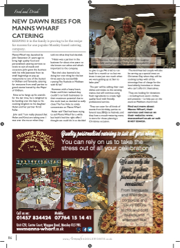Food and Drink NEW DAWN RISES FOR MANNS WHARF CATERING KEEPING it in the family is proving to be the recipe for success for one popular Mossley-based catering company. Manns Wharf was launched by John Stevenson 21 years ago to bring high quality food and personalised catering services to locals to suit all needs and occasions. John grew the business with his wife Jeannette from its small beginnings at pop-up restaurants to one of the busiest in Oldham and Tameside, catering for everyone from small parties to grand events hosted by the Mayor of Oldham. Now as he hangs up his utensils for the last time, he is delighted to be handing over the keys to his cooking kingdom to his daughter Helen and her partner Kristi Fuller. John said:“I am really pleased that Helen and Kristi are taking over. I was over the moon when they told me what they had decided. “Helen was a partner in the business for about nine years so she knows our ethos and what’s important to the company. “But she’s also learned a lot doing her own thing for the last three years, by successfully running The Foxhole in Meltham with Kristi.” However, with a heavy heart, Helen and Kristi realised they couldn’t run both businesses to their maximum potential due to the work load, so decided to sadly close The Fox Hole to solely concentrate on Manns Wharf. Helen said “Dad had been trying to sell MannsWharf for a while but hadn’t had the right offer. I thought we could do it so decided John Stevenson handing over Manns Wharf to daughter Helen (left) and her partner Kristi after a successful 21 years. to give it a go.We tried to run both for a month or so but we knew it was just too much when we were getting up at 3am to bake pies!” The pair will be adding their own dishes and twists to the existing menus, but will continue using fresh ingredients to create high quality food with friendly, professional service. They can cater for all kinds of events from birthday parties to funeral teas, BBQs to festivals, and they have a mouth-watering menu in store for those planning a Christmas occasion. The kind-hearted couple will also be serving up a special treat on Christmas Day when they will be cooking turkey with all the trimmings free of charge for the local elderly, homeless or those who can’t afford it themselves. They are looking for donations – including food, warm clothes and presents – to help put on the event at Meltham church hall. Find out more about Manns Wharf, their services and menus on their website: www. mannswharf.co.uk or call: 01457 834424. Quality personalised catering to suit all your needs... You can rely on us to take the stress out of all your celebrations! Call us on: 01457 834424 Mobile: 07764 15 14 41 We use only the finest, freshest produce for all occasions! From banquets and Weddings, corporate and luxury BBQ’s to Hot and cold buffets and afternoon tea! Unit C20, Centre Court, Waggon Road, Mossley OL5 9HL wwwmanns-wharf.co.uk 86 www.AroundSADDLEWORTH.co.uk