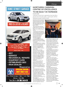 Motoring SPECIAL OFFER MOT ONLY £30 On production of this advert! around SADDLEWORTH 74 www.AroundSADDLEWORTH.co.uk www.aroundsaddleworth.co.uk NORTHERN CARNIVAL CENTRE OF EXCELLENCE TO BE BUILT IN TAMESIDE BY SARA TEIGER A Mossley carnival arts organisation has risen like a phoenix from the ashes after a catastrophic mill fifire destroyed 15 years’ worth of work. Global Grooves [1] lost hundreds of thousands of pounds worth of giant puppets and handprinted costumes when their storage warehouse at Ray Mill in Stalybridge burned to the ground in March. But now the charity is back and stronger than ever as it announces plans to turn its current home - The Vale [2] - into a £1million carnival arts hub. The project will create Tameside’s fifirst high quality and accessible arts centre, providing exceptional facilities for local and international artists, audiences, young people and communities from Greater Manchester and beyond. Arts Council England has contributed £490,000 to project through Small Capital Grant funding. Phase one is due to open to the public in spring 2020. A centre of excellence for carnival in the north, Global Grooves’ new facility will be only the second building dedicated to the development of carnival arts in England.The UK Centre For Carnival Arts opened in Luton in 2009. CEO Leon Patel said:“Global Grooves has a once-in-a-generation opportunity to create a world class arts facility in Tameside - the fifirst in the borough - consolidating all our activities in one place, catalysing a right buildings and equipment so that they can continue reaching new and broader audiences, to ensure that everyone is able to access arts and culture. I am proud to see that in this round of funding we have been able to give £3.6 million to support 11 organisations from across the north to achieve their ambitions to improve how they deliver arts and culture to our communities.” Arts and learning centre The Vale, on Micklehurst Road, was launched on a shoestring as a social enterprise in September 2015. Five partner organisations including Global Grooves put in £35,000 of their own money in order to open Vale Mill up to the public. Popular as the centre has been, offering a year round programme of borough-wide engagement with arts aCnd ocarnivtala, ancd tbuilding a locally- rooted, internationally connected, resilient and sustainable arts Paula Aicken 07l7ive4mu7sic,fifi0lm6sh5ow1ing4s,t3heatre, workshops and family activities, access organisation”. P“WaewuilllcreGateiacbcessioblenew 07817 915686 spaces in which audiences and participants will mix with most dynamic artists and ideas from around the globe, to learn, imagine, create, grow, and share breath-taking carnival arts here on the edge of the Pennine hills.” Alison Clark, director north,Arts Council England said:“This award will is compromised as entry is via a steep external staircase and some spaces are rudimentary and not completely weather proofed.The new centre will be fully accessible and fifinished to a high standard. Since 2003, Global Grooves has inspired people all over the globe to Keeping you on the road and safe this Summer give a new home to carnival arts in the north west and is great news for carnival which makes such a huge contribution to festivals and public celebrations. Centres like this are also so important to artists and communities and we are pleased to be able to support it.” working in the Gambia, Brazil, New Zealand, Singapore, and Trinidad & Tobago. It was founded by friends Holly Prest, Eraldo Marques, and Leon Patel. Leon and Holly met at a community music project in Mossley when they were 13-years-old. Now a National Portfolio Organisation, Global Grooves performs regularly to audiences of over 45,000 and have worked with thousands of participants around the world. 90 Sarah Maxfifield, area director north, Arts Council England, said:“The Arts Council’s Small Capital Grants help to ensure that organisations have the take part in carnival-style events, Motoring