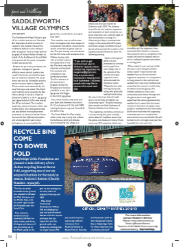 Sport and Wellbeing SADDLEWORTH VILLAGE OLYMPICS whole; was this year shared by Dobcross and LGFG.The winners (voted for by the umpires, organisers and volunteers of each event) do not know they have won until the night of their presentation evening. Co- Chairman Jon Mayor presented the trophy to the surprised LGFG team, and Scott Longley and Adrian Green (pictured) presented the trophy to the equally surprised Dobcross team the following evening. “Spirit of the games” plates are also presented to one boy and one girl from each village who in the opinion of the coaches and team organisers most demonstrated the Olympics motto: “Playing by the rules, winning with pride, losing with grace and making friends along the way, in the hope that, through sport, we will help strengthen our community spirit.” Pictured receiving their awards are Emily Hohmann & Ptolemy Gladwin from Dobcross. The organising committee carried out a survey during this years event(s) which asked for feedback about how the games can develop in future.There were over 230 responses which was 2018 REVIEW The Saddleworth Village Olympics got off to a rather wet start on Saturday 8th September.A brief moment of respite in the weather allowed the traditional balloons to be released after the games were formally opened by guest of honour Richard Foster on behalf of the Saddleworth Round Table who sponsored this years competitor medals (see pictured). Despite the (at times persistent) rain, organisers managed to get the athletics event started; readers may recall it had to be cancelled last year due to inclement weather.The junior event was won by Greenfifield and the senior honours went to Uppermill. These events were separated by the very fifirst tug-o-war event.The brand new trophies were presented by Bev Hilton (brolly in hand) to Delph & Denshaw (“D&D”) in 10/11 age group and Uppermill and LGFG who shared the 8/9 yr old award.The trophies have been named in honour of her late husband, Ben, who sadly passed away last year. Before the trophies were presented, co-chairman Adrian Green announced that;“[Ben’s] enthusiasm and encouragement was a major driving force in ensuring that the games have continued for as long as they have”. Poor weather was an unfortunate factor throughout the three weeks of competition and Adrian noted that he cannot remember a games quite as wet.This year hockey was introduced for the fifirst time with assistance from Oldham hockey club, who provided umpires and equipment on the day.The event was well attended and feedback from parents and competitors was extremely positive. The fifirst winners of this award were Lydgate, Grasscroft, Friezland and Grotton (“LGFG”) in the 10/11 age group and Diggle in the 12/13 age group. The overall winners award has this year been split between the juniors (7-11) and seniors (12-16) with D&D winning the Junior cup and Greenfifield the Senior cup. The Frank Sykes Fair Play trophy; which is the only trophy that reflflects the behaviour, spirit and attitude demonstrated by the village as a incredible and the organisers have expressed their thanks to everyone who took the time to complete it.The results will now be analysed with an aim to making the games even better in coming years. When asked to sum up how he felt this years event had gone,Adrian Green noted “I won’t lie the wet weather hurt us. It’s not nice for organisers, spectators or competitors to hang around in the cold and wet weather but I was truly humbled and amazed by the manner in which they all rallied round the games.The children seemed to love it, the community spirit shone through and the games were once again well supported.We cannot guarantee the weather but it seems that this event remains in the heart of a great many people in Saddleworth and that makes all the hard work that the organising committee put in to continue this event all the more worthwhile.We will be back to do it all again next year but hopefully the rain won’t be! ”if you wish to get involved next year in whatever capacity please contact the organisers via svogames@gmail.com. they are particularly interested in hearing from local businesses / business people who may like to sponsor the event next year. RECYCLE BINS COME TO BOWER FOLD Stalybridge Celtic Foundation are pleased to take delivery of two clothes recycling bins at Bower Fold, supporting one of our six adopted charities for the 2018/19 season, Reuben’s Retreat (Charity Number: 1150436). Charity Bins at Bower Fold 3rd November 2018 for their designated Charity Day at Stalybridge Celtic FC where they have lots of activities planned!’ The bins are easily accessible at the ground, one situated in between the Main Entrance and the Middle Gate, with the other right outside the Turnstiles near the Social Club. They welcome donations of any unwanted children’s or adult clothes and shoes, all shapes and sizes, so if you are coming up to the Match, going to the gym or just passing, you can drop them off anytime of the day and night. Mike Smith, Community Development Offificer, ‘We are delighted to help and assist Reuben’s Retreat with this request and hope that our supporters and the general public, can donate any clothing they no longer require.We also look forward to welcoming staff and volunteers from Reuben’s Retreat to Bower Fold on Saturday For more information contact Reuben’s Retreat - Website: www.reubensretreat.org Twitter:@ReubensRetreat: Telephone: 01457-680023 Email: enquiries@ reubensretreat.org #upthebridge 92 www.AroundSADDLEWORTH.co.uk