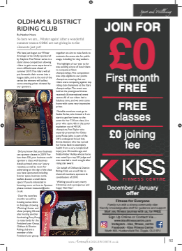 OLDHAM & DISTRICT RIDING CLUB By Heather Howe So here we are... Winter again! After a wonderful summer season ODRC are not giving in to the elements just yet! JOIN FOR £0 First month FREE FREE classes £0 joining fee December / January offer Fitness for Everyone Family run with a strong community vibe friendly knowledgeable staff for guidance and support Start you fifitness journey with us, for FREE Sign Up Online or Contact Via.... www.kissfifitnesscentre.com Instagram - kiss_fifitness_centre Facebook - Kiss Fitness Centre Warth Mill, Huddersfifield Rd, Diggle, OL3 5PJ We have just begun our Winter dressage series, kindly sponsored by Naylors.The Winter series is a stand alone competition allowing riders to gain more experience in more diffificult tests ahead of summer 2019.The riders will all put forwards their scores into a league table, and at the end of the series the winners will collect some amazing prizes donated by our sponsors. together we aim to raise funds to maintain the arena site for public usage, including for dog walkers. The highlight of our year so far was sending a host of local riders to compete at Stars championships.This competition was only eligible to our points champions, meaning that our riders were competing against top riding club champions at the Stars championships.The event was held at the prestigious Aintree racetrack & international event centre.All of our riders had a fabulous time, and we even came home with some very impressive prizes. Notable mentions must go to Saskia Eccles, who braved a 3 am start to get her horse to the event for her 7.30 am class, Livs prior who came 4th in the junior equitation out of 40 UK champions, Fran Taylor who expertly presented her Dales pony Rosie (who is part of the UK’s endangered breed list), Emma Stewart who has nursed her horse back to exemplary health from a very complicated injury just 18 months ago, and fifinally Amber Hulley whose horse was noted by a top UK judge and was awarded a much sought after rising star award. On behalf of Oldham & District Riding Club, we would like to thank all members, sponsors & contributors of 2018. Wishing you all a very merry Christmas and a prosperous and happy New Year! www.AroundSADDLEWORTH.co.uk Did you know that your business can sponsor classes in 2019? For less than £20, your business could sponsor a class, with business details printed onto our luxury rosettes, as well as room for advertising on the day of the class you have sponsored; including banner space, business cards, leaflflets & even a small demo space! If you’re interested in knowing more on how to Sponsor please contact treasurer@odrc. co.uk. Over the next few months we will be hosting some clinics in dressage, showing, Working Hunter and show jumping.We are also hosting another fundraising Pony Party, to raise funds for the Freizland user Group. Oldham & District Riding club are a member of the Freizland user group; 93 Sport and Wellbeing