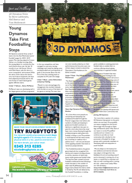 Sport and Wellbeing 3D Dynamos News by Steve Laithwaite, Neil Beevor and Tom Mcdermott Young Dynamos Take First Footballing Steps 3D Dynamos entered three under-7 teams into the East Manchester Junior Football League for 2018 / 2019 season.The matches, played at Curzon Ashton on a Sunday morning, allow the young players to continue the fifine work they’ve done over the last 18 months at our club Soccer School with Mark Aston, only this time in a more ‘competitive’ environment.While the ethos of the club at this level is very much about enjoyment, the boys have adapted particularly well to the new format of match based games against different teams. Under 7 Yellows – Barry McManus McManus’s team are developing well in the league games and have progressed in the cup competition, and have managed to overcome varying challenges each week by playing some exciting football and scoring plenty of goals in the process. Barry was the fifirst of the new coaching team to complete his FA Level One badge. Under 7 Blues - Jamie Edmondson and Jonny Fielding Placed in a very strong league the management duo worked tirelessly with the lads on some of the basics of the game at training.The team have not only recently picked up on their performances, but have also seen one of their players invited to attend the Manchester City Academy at the Etihad complex. Under 7 Reds - Paul White and Tom McDermott The Reds have enjoyed a mixed start to the season and the youngsters flflew out of the blocks in September.After some really good performances, the East Manchester League rewarded them with promotion to a more competitive division with teams of the Reds standard; effectively a double promotion.A disappointment in the cup and some stiffer tests haven’t deterred the side and they remain hopeful of rediscovering their early season form in the coming months. Open Age Dynamos Reversing the Decline At a time when more people are consuming and obsessing over professional football through the Premier League than ever before, the numbers of adults participating in grassroots football continues to decline at a signifificant rate year on year.At a time when there has never been more money flflowing through the professional game, adult grassroots football is facing a crisis.The problem is multi-layered and has many causes, but is starting to coalesce into a perfect storm – and not just because of the appalling weather that leads to numerous postponements. The Football Association, the game’s governing body has recognised this decline and created a funding scheme to aid the retention of adult male teams within grassroots football clubs. The fund has been created to boost football’s traditional format following a recent decrease in the number of adult male FA-affifiliated grassroots league teams. Retain the Game, which is funded by The FA and delivered by the Football Foundation, is making grants available to existing grassroots football clubs to enable them to continue offering valued playing opportunities in organised football. 3D Dynamos Football Club have secured this grant funding for the 2018 / 2019 season which will serve a useful purpose in the running costs of adult football.The Club’s sole aim was to maintain the current status quo of two adult teams, but this has been surpassed by the creation of an additional team for the current season due to the increasing number of players attending training and registering to play for the club.All three teams play in the Huddersfifield and District Football League, the First team currently in Division 3, the Reserves in Division 3 Reserves and the A team in Division 4. In excess of 50 players are playing adult grassroots football within their community club. Joining 3D Dynamos For more than a quarter of a century, 3D Dynamos have grown to the point where we now have 18 successfully run teams, ranging from the Soccer School (age 4-6), through to Open Age, and Veterans (Over 35’s). Each of our teams is run by FA qualifified coaches and our mission is to continue to provide our local community with a facility for the promotion of football for all age groups, with a particular emphasis on developing skills and enjoyment in youth football. We are always on the lookout for new additions and warmly welcome new players of all ages from the Saddleworth and surrounding areas. If you’re interested in joining one of our teams, or would like to volunteer and help out with coaching and/or running the club - please email Lesley Milne our club secretary: lesley.milne123@btinternet.com, or call our Chairman Carl Hirst on 07773 036593. AS SEEN ON MAKE YOUR CHILD’S DEVELOPMENT MORE FUN! TRY RUGBYTOTS Our dynamic weekly play sessions enable boys and girls aged 2–7 to develop their social and physical skills in a fun, positive environment. For more details, just call or email. 0345 313 0285 nicola@rugbytots.co.uk rugbytots.co.uk The world’s favourite rugby play programme 94 www.AroundSADDLEWORTH.co.uk