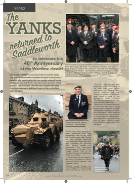 YANKS YANKS to celebrate the 40th Anniversary of the Wartime classic! This Summer’s Yanks weekend ensured fun for all the family. Very mixed weather failed to dampen the spirits of thousands of attendees who came to enjoy this ever popular weekend. Locals and visitors came together to enjoy the annual spectacle, taking place this year on the 9th, 10th and 11th of August with many choosing to dress up in traditional 1940s civilian and military wear once again. From left to rigtht: Alan Noble - Royal Regiment Fusiliers, Alan Clark - Royal Regiments Fusiliers, Stewart Taylor - Royal Electrical Mechanical Engineers, Terry Windsor - Royal Electrical Mechanical Engineer, Stuart Grantham - Parachute Regiment, Trevor Warren - Parachute Regiment and Shaun Taylor - Royal Artillelry. Tommy Buxton SAS - Special Air Service - Royal Marines On its 17th outing of staging the event, Saddleworth once again transformed itself for the three day festivities with flflags, bunting and even sandbags, decorating most businesses.There was once again something for everyone, with dancing, parade, re- enactments and sing-a-longs. Unfortunately a flfly past by a vintage bomber had to be cancelled because of conditions... which was a shame. “Unfortunately we are always at the mercy of weather, so had to make the diffificult decision.” one organiser told us. Sunday’s parade through the heart of Uppermill included Jeeps, tanks and cars, as well as a Sir This year celebrates the 40th anniversary of the 1979 fifilming of the movie Yanks, which starred Hollywood stars Richard Gere, Vanessa Redgrave and Lisa Eichhorn.A number of the scenes were fifilmed in areas of the Saddleworth Valley including Dobcross and Uppermill and close towns including Stalybridge. People flflock to Saddleworth from far and wide with some coming from as far as Australia to enjoy the festivities. Speaking to a visitor from Nottingham “Yanks weekend is just the best and I look forward to it every year. It is a shame about the weather but is just great to see how so many different people from all different ages really make the effort.” Image by Alan Bishop . 10 www.AroundSADDLEWORTH.co.uk The retururned to Saddlewororth