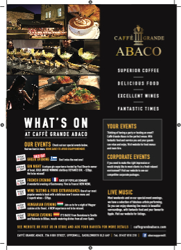 Out and About SUPERIOR COFFEE DELICIOUS FOOD EXCELLENT WINES FANTASTIC TIMES WHAT’S ON AT CAFFÈÈ GRANDE ABACO OUR EVENTS Check out our special events below, that we host in store. BOOK EARLY TO AVOID DISAPPOINTMENT. GREEK EVENING Don’t miss the next one! GIN NIGHT A unique gin experience hosted by Paul Sheerin owner of local, GOLD AWARD WINNING distillery DEFIANCE GIN. - £20pp. Not to be missed! FRENCH EVENING BACK BY POPULAR DEMAND! A wonderful evening of Gastronomy. Vive la France! NEW MENU, WINE TASTING & FOOD EXTRAVAGANZA One of our most popular events is back with a delicious new 5 course menu and 6 superb wines - £35pp. Most weekends and on our special event evenings, YOUR EVENTS Thinking of having a party or hosting an event? Caffèè Grande Abaco is the perfect venue. With fantastic food and service you and your guests can relax and enjoy. Visit website for food menus and room hire. CORPORATE EVENTS If you need to make the right impression or would simply like to meet clients in a fresh relaxed environment? Visit our website to see our competitive corporate packages. LIVE MUSIC HUNGARIAN EVENING Join us to for a night of Magyar cuisine at its finest. A NEW experience not to be missed. SPANISH EVENING IT’S BACK! From Barcelona to Seville and Valencia to Bilbao, mouth-watering dishes from all over Spain. we have a selection of fabulous artists performing. So you can enjoy stunning live music in beautiful surroundings, with fantastic food and your favourite tipple. Visit our website for listings. SEE WEBSITE OR VISIT US IN STORE AND ASK YOUR BARISTA FOR MORE DETAILS | caffegrandeabaco.com CAFFÈÈ GRANDE ABACO, 73A HIGH STREET, UPPERMILL, SADDLEWORTH OL3 6AP | Tel: 01457 810 218 | abacouppermill www.AroundSADDLEWORTH.co.uk 15 SOLD OUT TUESDAY 8 OCT TUESDAY 22 OCT TUESDAY 5 NOV TUESDAY 10 SEPT THURSDAY 19 SEPT TUESDAY 24 SEPT