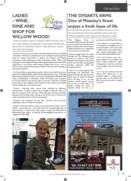 LADIES – WINE, DINE AND SHOP FOR WILLOW WOOD! There are many ways to support Willow Wood, but if you enjoy fashion, shopping or lunching with friends, there are two fantastic ways to help and have a great time into the bargain. The fifirst one to put in your diary is the Fizz Fashion Show on Thursday 17 October. Held in the lovely function room at Ashton-under-Lyne Golf Club, it’s a great opportunity to update your Autumn and Winter wardrobe, as well as getting your pick of the party outfifits. Make a real evening of it with family and friends; following the fashion show there’ll be ample time to try and buy while having a cheeky drink or two - and as 10% from each sale will be donated to Willow Wood, you’ll be helping us with every purchase! And if you’d like an opportunity to show off your new outfifit, book your place for the Willow Wood Ladies’ Winter Wonderland Lunch. Following the success of last year’s event, it’s once more being held at Oaklands Hall, Hyde, on Wednesday 11 December. Elaine McConnell, event organiser for both the fashion show and the ladies’ lunch said:“The lunch is an ideal opportunity to get together with friends and relax before the frenetic activity leading up to the festive season. “There’s a delicious three course lunch followed by afternoon entertainment. It really is a good way to indulge in a little ‘me time’, and take the pressure off for the day. We’ve also got the Pop-up Fashion Boutique and the Body Shop coming, so there’ll be time to browse and maybe even fifinish off your Christmas shopping. “Everyone who attended last year had a fantastic time, and we’re expecting a sell-out occasion once again.” Tickets for the Fizz Fashion Show are just £6, and the ladies’ lunch is £34.50 – great value for a very tasty meal and a packed afternoon of entertainment. To book your place please contact the Willow Wood fundraising offifice either by emailing fundraising@willowwood.info, or ringing 0161 330 7788. THE DYSARTS ARMS One of Mossley’s fifinest enjoys a fresh lease of life Our treasured area has many hidden treasures, but one in particular has been getting both locals and visitors excited on the cusp of the Mossley border. The Dysarts Arms, on Huddersfifield Road has been taken over by well known entrepreneurs Jason and Dave, who are aiming to make this historic Inn a destination of choice this coming season. Having managed both The Royal George and The Clarence, Jason, joined by talented Chef Dave Spencer have injected a fresh lease of life into the place having gained positive experience within the hospitality sector. They are currently applying their knowledge and enthusiasm into good use, along with the rest of the small team, to make The Dysarts Arms the place to be. Its cosy interior, outside garden terrace and private car park make it the perfect setting for either an intimate dinner for two or a private party with friends & family. One thing you can guarantee at The Dysarts is incredible value for money and with a new menu, then it really worth a visit, maybe after a walk around Dovestones. down the stunning Huddersfifield Canal. This locals favourite also has a great selection of real quality ales which include Robinson’s award winning ales, as well as a selection of other lagers, cider and Guinness on tap. For all up and coming news and events, then please go to the facebook page or contact Jason and the team on Tel: 01457 237 898. They look forward to seeing you soon! NOW UNDER NEW MANAGEMENT Jason & Dave welcome you to... Homemade Food Served Daily with Menu & Daily Specials created by Head Chef Dave Spencer 12 Noon - 9pm 2 Meals for £12 served (Mon - Thurs) Friendly welcome • Dog friendly • Free WiFi Open 7 days a week from 12 til late Quiz nights Monday & Thursday Exciting Refurbishment planned in near future DYSARTS ARMS OF MOSSLEY Tel: 01457 237 898 Huddersfifield Road . Mossley . OL5 9BT Elaine is ready to take your booking! www.AroundSADDLEWORTH.co.uk 19 Out and about