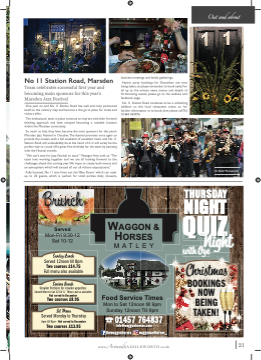 No 11 Station Road, Marsden Team celebrates successful fifirst year and becoming main sponsors for this year’s Marsden Jazz Festival One year on and No 11 Station Road has well and truly positioned itself on the culinary map and become a the go to place for locals and visitors alike. The enthusiastic team in place continue to impress with their forward thinking approach and have enjoyed becoming a valuable location within the Marsden community. So much so that they have become the main sponsors for this year’s Marsden Jazz Festival in October.The festival promises once again to provide the masses with a full weekend of excellent music and No 11 Station Road will undoubtably be at the heart of it. It will surely be the perfect way to round off a great fifirst birthday for the team by partying with the Festival crowds. “We can’t wait for Jazz Festival to start.” Manager Amy told us. “The team love working together and we are all looking forward to the challenges ahead this coming year.We hope to create both menus and an atmosphere which will exceed all our all visitors expectations.” Fully licensed, No 11 also hires out the ‘Blue Room’ which can cater up to 20 guests, which is perfect for small parties, baby showers, Brunch Served Mon-Fri 9:30-12 Sat 10-12 business meetings and family gatherings. Festive party bookings for December are now being taken, so please remember to book early. For all up to the minute news, menus and details of forthcoming events, please go to the website and facebook page. No 11, Station Road continues to be a refreshing addition to the local restaurant scene, so for further information or to book, then please call Tel: 01484 443976. Liz Baker Photography. THURSDAY NIGHT QUIZ Sunday Lunch with Oye t Ni igh ht Served 12noon till 8pm Christmas Two courses £14.75 Full menu also available WAGGON & HORSES MATLEY Seniorors Lunch Smaller Portions for smaller appetites Served Mon to Sat 12 till 4. Three course available Not served in December Two courses £8.95 Served Monday to Thursday 5pm till 9pm - Not served in December Two courses £13.95 Food Service Times Mon to Sat 12noon till 9pm Sunday 12noon Till 8pm 01457 764837 info@waggonhorses.com thewaggonhorses waggonandhorses_ BOOKINGS NOW BEING Set Menu ☎ ! TAKEN! www.AroundSADDLEWORTH.co.uk 21 Out and about