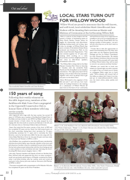 Out and about LOCAL STARS TURN OUT FOR WILLOW WOOD Willow Wood are proud to announce that the well-known, and well-loved, local celebrities Mark Llewellin and Jane Hodson will be donating their services as Master and Mistress of Ceremonies at the forthcoming Willow Ball. The wonderful Mark Llewellin and Jane Hodson. 150 years of song Following their weekly rehearsal on the 28th August 2019, members of the Saddleworth Male Voice Choir congregated in the Uppermill Conservative Club to honour three of their members with long service awards. John Lapworth who sings with the bass section has served 40 years. In 1979 John was a member of the Bamford Chapel Choir in Rochdale and was invited to join SMVC by Walter Brisk who was musical director of both choirs. He has really enjoyed his time singing with the choir, both at concerts and festivals in the UK, and the overseas visits to Germany, Holland, Italy and Slovenia. Stuart Iles joined the fifirst tenor section of the choir in1969 and has completed 50 years service. Stuart has held several posts on the choir committee, having been choir secretary for 10 years, membership secretary for 11 years and is currently the choir librarian, a post he has held since 2002. He has also sung with the Colne Valley Male Voice Choir for the past 33 years and was made an Honorary Life Member of SMVC in 2013. John Redfearn has completed an astonishing 60 years membership with the choir. John’s father was a founder member of the choir and John became a member when he completed his post school studies. He has had a phenomenal relationship with the choir, having served in every position on the committee and even marrying the choir’s founding MD Denis Jones’s daughter back in 1967. John says,“Several members and friends of both our families have been involved with and supported the choir on many occasions. I recall one particular performance of Messiah conducted by Denis when I, my father, brother, wife, her mother, uncle and cousin all took part in the chorus. John was made an Honorary Life Member of SMVC in 2012.” The event concluded with a presentation to Mr. Malcolm Hill, who has completed 35 years as the Choir President. Rear L to R, John Redfearn (60 yrs), Malcolm John Watts (Chairman), Front L to R, Stuart Margaret Hill, John Lapworth (40 yrs) Hill (President), Dorian Kelly (MD), Iles (50 yrs), Brends Iles, Dilys Redfearn, Mark is a patron of the Hospice and has hosted a number of fundraising events at Daisy Nook Garden Centre, where he juggles his directorship with after-dinner speaking, hosting events and writing. Jane is also no stranger to Willow Wood, they were co-hosts of the Ashton Variety Show, produced and directed by Mark at the sadly missed Tameside Hippodrome. They have worked together for 27 years after meeting while working on a radio documentary and have delighted audiences ever since as after-dinner speakers, broadcasters and more. The Willow Ball is being held at the Best Western Smokies Park Hotel on Saturday 5 October, with the wonderful Andy Powell and His Swing Band as the headline entertainers. This eight piece band will be playing a mix of classic American standards together with more up-tempo hits to get everyone on the dance flfloor. Elaine McConnell is the organiser of the Ball and said “I can’t tell you how much we’re all looking forward to the evening. It’s a celebration of Willow Wood’s 20 years here at the heart of our community, and we’d love as many of our supporters as possible to join us for an amazing night out. As well as the Andy Powell Band we’ll be having a number of other guests – we can’t tell you who they are, as we don’t want to spoil the fun! “I’d also like to take this opportunity to thank local businesses Your Tax Shop who have taken out the Platinum Sponsorship Package and the Liz Pollard Consultancy for their Bronze Sponsorship. By making these fantastic donations, they are ensuring that more of the proceeds will come back to Willow Wood where they will be used to care for our patients and their families.” Whether you would like to book two tickets as a special night out with a partner, or a table of ten as a thank you to clients or colleagues, Elaine urges you to book early. “We’ve already sold around half of the tables, so please don’t leave it too late. Just go to www.willowwood.info where you can book online, easily, quickly and securely.” 22 www.AroundSADDLEWORTH.co.uk Rear L to R, Malcolm Hill (President), Dorian Kelly (MD), John Watts (Chairman), Front L to R, Stuart Iles (50 yrs), John Redfearn (60 yrs), John Lapworth (40 yrs)