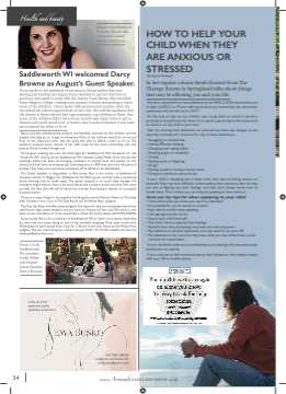 Health and beauty Owner of Saddleworth Cookery School and September Guest Speak, Pam Jones Saddleworth WI welcomed Darcy Browne as August’s Guest Speaker. Darcy spoke to the members of her time in Kenya earlier this year. Having just fifinished her degree Darcy decided to put her free time to good use and opted to work with the charity Team Kenya. She travelled from village to village, visiting local primary schools and getting to know some of the children. Darcy spoke with passion and emotion when she recounted the culture experienced on her visit. She told the audience that the classes at these schools had approximately 100 children in them, that some of the children didn’t have shoes, would walk many miles to get to classes and would spend over 11 hours a day in school because it was safer environment for them to be in. Darcy said she witnessed the poverty and hardship endured by the children and the lengths that they go to to get an education. Most of the children would sit on the soil flfloor of the classroom with only the lucky few able to afford a chair to sit on. The audience enjoyed every minute of her talk, made all the more interesting with the photos Darcy showed though-out. The August meeting was also the fifinal night for Saddleworth WI’s donations for the “Smalls for All” charity, led by Saddleworth WI member, Cathy Wilde. Over the last few meetings Cathy has been encouraging members to donate bras and panties to this charity and has done an amazing job, collecting over a 1000 bras and over 60 packs of panties.They have now sent these donations off to Africa to be distributed. The Guest Speaker in September is Pam Jones. Pam is the owner of Saddleworth Cookery School in Diggle. The Saddleworth WI Skills group recently held a workshop there learning how to make tapas. The group enjoyed it so much they thought the members might want to learn a bit more about the cookery school and how Pam came up with the idea. She will tell all about her journey from being a teacher to successful business owner. There are many things in the pipeline including the annual Fashion Show on Thursday 24th October from 7 pm in The Oak Room at The White Hart, Lydgate. The Pop-Up-Shop will offer many bargains.The items for sale are mostly garments from well-known high street retailers and are sold at a fraction of the cost.The show is also open to non-members, so if you would like a ticket (£5 each) please call 07763 028466. If you would like to be a member of Saddleworth WI or learn more about what they do, then why not come along to one of the monthly meetings. They meet on the fifirst Wednesday of each month from 7 pm for 7.30 pm in the Oak Room at the White Hart, Lydgate. You can come along as a visitor and pay £3.00. For further details visit them at www.saddleworthwi.com HOW TO HELP YOUR CHILD WHEN THEY ARE ANXIOUS OR STRESSED By Sarah Howard In her regular column Sarah Howard from The Therapy Rooms in Springhead talks about things that may be affffecting you and your life. Key facts reported from data published by the NHS in 2018 showed that one in eight (12.8%) 5 to 19 year olds had at least one mental disorder when their assessment was carried out in 2017.* At this time of year as our children start to go back to school it can be a particularly stressful time for them. So it may be a good idea to fifind some time to check in on any child in your care. Start by noticing their behaviour, ask yourself are there any changes to the way they normally act? Look out for any of these behaviours... • Struggling to concentrate • Having diffificulty sleeping • Changing their eating habits • Showing anger or irritability • Crying • Feeling tense or fifidgeting • Clingy • Feeling unwell or having a tummy ache • Change in behaviour, tantrums etc If your child is displaying any of these then they may be feeling anxious or stressed. They may have diffificulty understanding their emotions, after all they are new at fifiguring out their feelings and they don’t always know how to handle them.This is where you can help, by speaking to them about it. Here are my tips for when speaking to your child • Find a time when you know you won’t be disturbed • It’s essential for you to remain in control • Stay calm & mindful when speaking • Use age appropriate words • Ensure your child feels safe • Give them time to express their feelings • Remind them that any feelings they have are only temporary • Pay attention to physical symptoms, you may need to see your GP • Pay attention to any concerns they have, what you may think trivial, a child can think it’s catastrophic. If your child feels understood and listened to any feelings of stress and anxiety should start to subside. If you continue to feel concerned about their behaviour then always consult with your GP or health advisor. From L to R: Saddleworth WI member, Cathy Wilde and August Guest Speaker, Darcy Browne make-up artist eyebrows stylist eyelashes extensions 24 www.AroundSADDLEWORTH.co.uk +44 7462 386359 instagram.com/busko.ewa ewabusko@yahoo.com