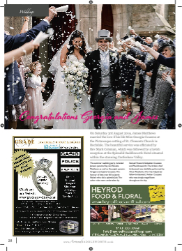 Weddings Congratulations Georgia and James On Saturday 3rd August 2019, James Matthews married the love if his life Miss Georgia Couzens at the Picturesque setting of St. Clements Church in Rochdale. The beautiful service was offiffifficiated by Rev Mark Coleman, which was followed by a lavish reception at the Splendid Saddleworth Hotel situated within the stunning Castleshaw Valley. The summer wedding party included James’s parents Ray and Rosalia Matthews as well as Georgia’s parents Gregory and Jayne Couzens.The honour of best man fell to Jamie Noke’s who did a splendid job.The usher roles were undertaken by Samual Howard, Sebastian Couzens and Paul Ainsworth.The bride’s chief bridesmaid was dutifully performed by Alicia Matthews, who was helped by fellow bridesmaid, Amber Couzens who was simply magnifificent throughout the day. 28 www.AroundSADDLEWORTH.co.uk Images by Christopher Lewis Photography