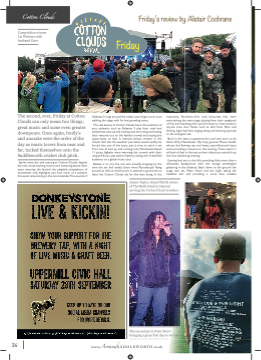 Cotton Clouds Competition winner Liz Webster with husband Dave Friday’s review by Alistair Cochrane Friday The second, ever, Friday at Cotton Clouds can only mean two things; great music and some even greater downpours. Once again, brolly’s and anoraks were the order of the day as music lovers from near and far, tucked themselves onto the Saddleworth cricket club pitch. Spirits were dry and soaring at Cotton Clouds despite the real clouds looking much more menacing above. Even upon entering the festival the palpable atmosphere of excitement only highlights just how much of a stalwart this event is becoming in the local calendar.The sounds of Alabama 3 rings around the valley. Lead singer Larry Love stalking the stage with his low, growling tones. The real beauty of Cotton Clouds lies in the selection of acts, stalwarts such as Alabama 3 play their tried and tested sets, new, up and coming acts are trying and testing their material out on the festival crowds and seizing the opportunity at that. It seemed almost written in the clouds that this fair-weather journalist would swiftly be forced into one of the tents, just in time to catch a set from one of said up and coming acts. Manchester-based 11 piece, Agbeko were warming the crowds with their unique African, jazz styled rhythms, taking the Greenfifield audience on a global music tour. Believe it or not, the rain was actually stopping by the time the set had ended, there were Pterodactyls flflying around as well, at which point it seemed a good time to leave the Cotton Clouds ale for the time being. In the meantime, Northern-Irish rock favourites, Ash, were entertaining the main stage, playing from their songbook of hits and thanking their good fortune to have landed a dry-ish time slot. Tracks such as Girl from Mars and Shining Light had fans singing along and dancing joyously to the energetic set. Back in the tent, it appeared the roof was soon to be lifted off by Manchester Hip Hop ground, Mouse Outfifit, whose fast-flflowing rap and heavy, jazz-inflfluenced beats were providing a bounce to the evening.There wasn’t a still pair of feet in the tent as their infectious sounds lit up the now darkening evening. Evening had set in, the hills providing little more than a silhouette background with the orange streetlights glittering in the distance. Back down to the ground the stage was set. Peter Hook and the Light taking the headline slot and providing a more than suitable James Taylor, Head Chef & owner of The Bulls Head in Heyrod serving the Cotton Cloud revellers. The second pic is Peter Hook bringing a great fifirst day to an end. 36 www.AroundSADDLEWORTH.co.uk