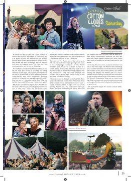 A familiar face was up next. Joe Carnall, formally of Milburn and current lead singer of Good Cop Bad Cop graced us with his presence on the Spinning Rooms stage. His set was just electric, holding onto a fully packed out tent throughout with his exciting new tunes and engaging banter.This is the one I was most excited for and oh boy, he did deliver. As I walked out of Spinning Rooms, heading to the bar, my head gets turned by an ‘effifing and jeffifing’ reverend on the stage....Oh My God! It’s The Church are one of the best fifinds of 2019 - offensive, hilarious, cringe-worthy, they were magnifificent. Everyone around me is dancing and singing along, and I couldn’t help but join in. I remember saying after, ‘What the hell did I just watch? Where can I watch them again?’ BBC Radio and Television legend, Mark Radcliffe and his ‘band’ UNE were just something else.And I’m not sure in what way I mean that. His Bowie cover, brilliant. His banter in between songs, hilarious.Worth the below-par original music that you could never tell if they wrote as a joke or not? Undecided. Reverend and The Makers turned the volume up to 100. No one could resist bopping along to the tunes of the ‘Heavyweight Champion of The World’ hitmakers. John McClure is a natural in front of a crowd, getting what looked like every single one of the 5000 people at the festival moving, engaging with the audience in a way that made everyone feel included, forcing every single person to fall in love with them in less than an hour. The true winners of the night were Hyde Park Brass. Only in Saddleworth, home of the Whit Friday Brass Band Contests would a brass band draw in such a crowd. Stretching seven or eight rows out of the Spinning Rooms tent, the Leeds based band get started with their outstanding set, playing dance and Saturday Images on this page by Nick Maw pop bangers, one after the other until we were all at their mercy. non-believers converted, the tent was alive with dance, people jumping and raving, losing their mind to possibly be the best brass band in the world. As the day drew to a close, everyone’s attention was set on the Main Stage. The Wailers were headlining, and it couldn’t have been a more ideal choice.Through the madness of the day, so many genres, ups, downs, dancing and swaying, The Wailers gave us a much- needed chill pill. Closing on a day that we could never forget, we were treated to all of the classics, one love, We Jammin’, Redemption Song, and so many more that fifilled our hearts with joy and would end up acting as the sign off at the end of a festival that had been oh so good to us. The countdown begins for Cotton Clouds 2020... Can’t wait! ing . Reverend & The Makers ing . www.AroundSADDLEWORTH.co.uk 39 Cotton Clouds d d