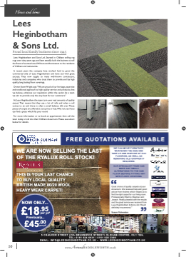 House and home Lees Heginbotham & Sons Ltd. Proud local family business since 1945 Lees Heginbotham and Sons Ltd. Started in Oldham selling rag rugs over sixty years ago, and have steadily built the business to sell the fifinest of worsted wool Wiltons and Axminsters to the residents of Oldham and nationwide. In recent years the company have worked hard to grow the commercial side of Lees Heginbotham and Sons Ltd with great success. They now supply to many well-known contractors, industries and companies who trust them to provide and lay high quality, long lasting flfloor coverings. Owner Steve Wright says “We are proud of our heritage, expertise and traditional approach to high quality service and products, that we believe, enhances our reputation within the sector. As a team we aim to provide only the very best for our customers.” At Lees Heginbotham the team turn over vast amounts of quality carpet. That means that they use a lot of rolls and when a roll comes to an end there is often a small balance left over. These pieces of carpet are offered at cost price or less.Why not see if you can fifind a piece which fifits your room! For more information or to book an appointment then call the team today or call into their Oldham showroom. Please see advert below for details. FREE QUOTATIONS AVAILABLE WE ARE NOW SELLING THE LAST OF THE RYALUX ROLL STOCK! WE CAN MOVE FURNITURE, WHATEVER THE SIZE AND TAKE UP AND DISPOSE OF OLD FLOORING, AS WELL AS REMOVING OLD GRIPPER IF REQUIRED. THIS IS YOUR LAST CHANCE TO BUY LOCAL QUALITY “ BRITISH MADE 80/20 WOOL HEAVY WEAR CARPET! Good choice of quality carpets at your showroom. We received help and good advice from Andrew which helped us to fifind the right carpet for our living room. Professionally fifitted by Stephen and Joseph. Really pleased with the results and the great service we received from Lees Heginbotham & Sons Ltd. Would defifinitely recommend.” Susan Fishenden OUR SPECIALIST TEAM CAN MAKE ANY SMALL ALTERATIONS TO THE SUB FLOOR BEFORE FITTING ANY NEW FLOOR COVERING. NOW ONLY... per yd2 £18.95 Previously... per yd2 £45.00 5 CHAUCER STREET (VIA BRUNSWICK STREET) OLDHAM CENTRE, OL1 1BA. TEL: 0161 624 6631 / 0161 628 2369 EMAIL: INFO@LEESHEGINBOTHAM.CO.UK • WWW.LEESHEGINBOTHAM.CO.UK 50 www.AroundSADDLEWORTH.co.uk “