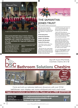 House and Home A recent concert in The Great Hall at Rochdale Town Hall. THE SADDLEWORTH MALE VOICE CHOIR is holding an “Open Rehearsal” on Wednesday 11th September from 7.30pm at The Old School, corner of Lee St. and Station Rd. Uppermill, Saddleworth OL3 6HQ. The rehearsal is open to men of all ages and singing abilities, even those who think they can’t sing and you don’t need to be able to read music. Come along and join us for an inspiring and fulfifilling evening of singing, you are guaranteed a warm welcome. To fifind out more about the choir visit our website at: http:// saddleworthmvc.org/ Out and About THE SAMANTHA JONES TRUST New Market dates announced After their summer break,The Samantha Jones Trust charity are returning with their monthly markets from September at Uppermill Civic Hall. Forthcoming dates: Sunday 8th September Sunday 13th October Sunday 10th November Sunday 8th December All markets are free to enter from 10am to 3pm with free parking available. They will have their trusted regular stall holders in attendance with new goods including clothing, bags, beauty, jewellery, hand made items and craft as well as local food produce. The TSJT fundraising stall will also be there as well as the charity Caféé serving hot food and cake all day. New for 2019 the charity are featuring the traditional Civic Hall flflea market, with a dedicated chamber room for people to pick up a bargain or two from pre-loved items. The events help to continue to raise funds to help local children and families living with Leukaemia.TSJT have been grateful to have received such good local support and hope this continues so they can sustain the work they do to improve quality of life for children and their families. For more information please contact the team on 01457 829479 or email info@thesamanthajonestrust.com www.thesamanthajonestrust.com Haycroft House,Wharf Street, Dukinfifield, Cheshire, SK16 4JF. Bathroom Solutions Cheshire Come and visit our extensive bathroom showroom with over 50 full bath/shower room displays, wet rooms, whirlpools and much, much more! Supply and installation service available. Please call for a FREE QUOTATION email: bathroomsolutionscheshire@hotmail.com Find me on OPENING TIMES Mon-fri: 9.00 to 5.30 Sat: 9.30 to 5.00 BANK HOLIDAYS: 10.00 to 4.00 www.bathroomsolutionscheshire.co.uk Telephone. 0161 393 5693 Facebook 54 www..AroundSADDLEWORTH..co..uk 1 WE WILL BEAT ANY WRITTEN QUOTE