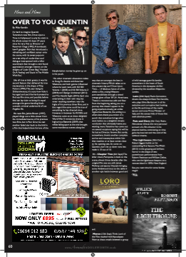 House and Home OVER TO YOU QUENTIN By Mike Kemble It’s hard to imagine Quentin Tarantino’s new fifilm, Once Upon a Time in Hollywood is only his ninth in his whole career. It’s been 27 years since his very fifirst as Director of Reservoir Dogs (1992).A bombastic low-fifi gangster flflick that introduced a refreshing and confifident auteur onto the scene, with its sweet popcorn rat-a-tat whip of cooler-than-cool dialogue interspersed with a killer soundtrack than brought a new-found appreciation amongst viewers on the delights of ‘Little Green Bag’,‘Hooked On A Feeling’ and ‘Stuck In The Middle With You’. Like all true artistic greats, it was his second feature that delivered his true masterpiece, in the shape of Pulp Fiction (1994).This year being its 25thanniversary, it’s scary how little it has aged, and you’d be hard-pressed to fifind any fifilm since, and possibly before that can lay claim to being it’s equal amongst the genre-bending black- comedic criminal underworld of Los Angeles life. His next fifilm, Jackie Brown (1997), played things out a little slower from the immediate bounce of his previous two fifilms, but in Pam Grier, he cast another faded star back to the fold in a fifilm that helped share his love of the blaxploitation movies he grew up on in his youth. His other cinematic obsessions relate to Kung-Fu classics and American Westerns, and both genres inflfluenced where he went next, with Kill Bill: Volume 1 (2003) and Kill Bill:Volume 2 (2004); and Django Unchained (2012) and The Hateful Eight (2015). Each one entertaining in their own way, but never reaching anywhere near the highs of his previous three fifilms, and in this regard the same could be true of everything he has directed since. However, in between his Kill Bills and Westerns came an at times delightful World War II revisionist drama in Inglourious Basterds (2009), that whilst falling apart at the end brought some wonderous scenes along the way that are amongst the best in cinematic history.Which takes us to the present day and ‘Once Upon Time..........’.A fabulous fusion of a fifilm within a fifilm, mixing Western yarn-sensibilities through a tinted orange glow of late ’69 LA Americana. There’s a monotonous ebb and flflow from the beginning, taking you on a journey that doesn’t appear to be going anywhere slowly, yet unlike Inglourious Basterds, the ending is a wham-bam-thank-you-ma’am of a punch that somehow brings what went before to a delightful climatic conclusion that ultimately leaves you wanting more.Tarantino has come out on several occasions saying this will be his last as Director, forever. But surely, somewhere, there’s another complete end-to-end masterpiece within him that matches or at least comes close to his opening sets. So come on Quentin, don’t let us down now, lets make it 10 out of 10. It - Chapter Two (6th Sept):The killer clown, Pennywise is back on the scene, almost three decades after the original fifilm was set, with James McAvoy and Jessica Chastain bringing some Hollywood clout to the table in another epic battle between good and of wild teenage guerrilla bandits somewhere in the heart of South America in this dystopian thriller directed by the excellent Alejandro Landes. Loro (20th Sept): Paolo Sorrentino directs the always brilliantToni Servillo, who plays Silvio Berlusconi in all his seductive and corruptive best looking at the life and times of the media tycoon and once Prime Minister of Italy, and the excess folly of those that seek absolute power. Pain and Glory (4th Oct): Pedro Almodovar directs this very personal account of a fifilm director in his physical decline, reminiscing on time gone by; love lost and the void of life without cinema. The Lighthouse (18th Oct): Robert Eggers builds on his outstanding fifirst feature,The Witch (2015) in this gripping and brilliant horror in the shape of two powerhouse performances from Robert Pattinson and William Defoe, who are the lighthouse keepers on a remote island in 1890s New England. See you next time for some festive magic! Mike evil. Monos (13th Sept):Think Lord of the Flies mashed with Apocalypse Now as chaos entails between a group 60 www.AroundSADDLEWORTH.co.uk