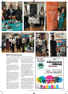 BNI Paramount July networking and trade event deemed a success On Wednesday 17th July, Milan Bar in Lees provided the ideal setting for the fifirst networking and trade event hosted by the newly formed BNI Paramount. With over 35 local businesses in attendance showcasing their unique products and services, the venue was a hove of activity from start to fifinish and was deemed a massive success by organisers. The weather was certainly a hit as the general public and BNI members enjoyed refreshments on the terrace in between speaking to the many businesses on show.There were also a number of guest speakers and demonstrations throughout the day which proved very popular and informative. Based at the White Hart in Lydgate, BNI Paramount are a group of local Oldham business owners who meet every Tuesday morning to discuss their businesses and help each other grow through referral networking.The group are growing quickly and their goal is to have 30+ members by September which will generate over £1,000,000 of business between them. So, if your serious about growing your business and increasing your sales, would like to be part of this growing networking group and would like an invitation to meet the members, then contact Rachel Freeman (rachel@seftonandco.com), Gary Vèère(gary@verenorth.co.uk) or Tom Croft (info@croft-electrical.co. uk) who will be happy to answer all your questions and get you put on the guest list. The next event will be on the 19th September held at the Oldham Events Center (Oldham Athletic FC) between 5pm - 8pm. The event is hoped to raise money for Dr. Kershaws and will include food created by Master Chef Winner Simon Wood. For further details, then please see the poster on this page or contact any of the BNI Paramount representatives above. www.AroundSADDLEWORTH.co.uk 63