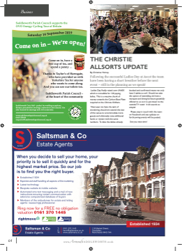 r e b m t 4e y e 1p a d r r u t e a i S 0 1 9 ’ e W S – n n o e m o p e n ! C o 64 www.AroundSADDLEWORTH.co.uk Business Saddleworth Parish Council supports the OVO Energy Cycling Tour of Britain 2 Come on in, have a free cup of tea, and spend a penny ......... Thanks to Taylor’s of Harrogate, who have provided us with Yorkshire Tea for anyone who wants to come along. And you can use our toilets too. Saddleworth Parish Council – at the heart of the community Saddleworth Civic Hall – perfect for wedding receptions, dinners, presentation evenings, conferences and concerts. It is also licensed for marriage and civil ceremonies. www.saddleworthparishcouncil.org.uk 01457 876665 enquiries@saddleworthparishcouncil.org.uk THE CHRISTIE ALLSORTS UPDATE By Christine Harrop Following the successful Ladies Day at Ascot the team have been having a short breather before the next event – still in the planning as we speak! Ladies Day fifinally raised over £4,600 which is incredible for 120 paying ladies. This is a massive chunk of money towards the Carbon Base Plate required at the Christie Oldham. Next year we have the task of wondering should we extend the size of the venue to accommodate more guests and ultimately raise additional funds or remain with the same numbers. To date the tables already booked and confifirmed means we only have 2 tables to sell. Should we take the option of extending, we have a marquee and dining furniture gratefully offered to us so it is just down to the outside TV costs! It all sounds so simple! Please stay in touch with the team on Facebook and any updates on forthcoming events will be posted. See you next time!