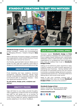 VèèreNorth STANDOUT CREATIONdSesTigOn &GprEinTt YOU NOTICED! VèèreNorth Design & Print – are an independent design company - owned and choreographed by Managing Director / Graphic Designer Gary Vèère. With a vast array of projects, designs, companies and organisations under his belt there isn’t much that Gary hasn’t turned his hand to! His friendly, approachable manner draws you in whilst his skill, zeal and creativity never fails to disappoint: all delivered with a sensible price tag. CREATIVE RANGE From branding and logo creations, brochure illustrations, bespoke exhibition stands, large format, comprehensive corporate reports, natty promotional gifts to wallpaper designs - Gary can devise and produce the lot. He will advise, design, print, complete and deliver! CREATIVITY PROCESS Gary will listen to your ideas, provide thoughts, offffer suggestions combined with his knowledge and skill he will guide you on a journey to completion. He instils confifidence along the way, never forcing ideas but gently suggesting and quietly adapting to his clients’ feedback. LOCAL BUSINESS – NATIONAL APPEAL Tameside based VèèreNorth Design & Print provide creative messages with national appeal. From a Harley Street medical clinic, well-known restaurant chains, hotels and bars, multiple NHS organisations to professional local businesses; they have all instilled their trust in VèèreNorth Design & Print. Calling on his extensive years’ experience, Gary is able to supply you with a holistic approach to marketing your business. Having worked with thousands of businesses giving him the license to provide a complete design and print solution, commissioned just for you. He knows what he is talking about and knows what works! Need to get your business noticed with a creative brand then why not choose VèèreNorth Design & Print to produce the solution? VèèreNorth Design & Print Ashton Old Baths, Stamford Street West, Ashton under Lyne, TamesideOL6 7FW VèèreNorth design & print www.verenorth.co.uk VèèreNorth design & print North Vèère