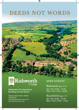 DEEDS NOT WORDS Rishworth ES T.1724 Independent Co-educational Boarding and Day School Rishworth, West Yorkshire, HX6 4QA 01422 822 217 admissions@rishworth-school.co.uk www.rishworth-school.co.uk OPEN EVENTS Rishworth Ages 11-18 Sat 5 Oct 10:00 - 12:30 Thu 7 Nov 17:30 - 20:00 Heathfield Ages 3-11 Sat 5 Oct 10:00 - 12:30 Mon 14 Oct 13:00 - 17:30