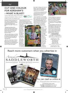 SEPTEMBER - OCTOBER 2019 O Cotton Clouds cover Greenfifield Pages 34 to 37 Wedding Bells Win £100 voucher For Charles Vermont Page 67 Yanks for the memories. 2017 coverage of the event Page 14 - 16 Anise Indian competition. Win a meal for 2 Page 21 Ring out for Kristie and Jake Page 38 - 39 Read me at www. aroundsaddleworth.co.uk SADDLEWORTH ❘ OLDHAM ❘ SHAW ❘ ASHTON ❘ STALYBRIDGE ❘ MOSSLEY ❘ DUKINFIELD ❘ MARSDEN ROYTON ❘ HOLMFIRTH ❘ RISHWORTH ❘ RIPPONDEN September - October 2017 DISTRIBUTED FREE Find/Follow us T E M Y O U O R SEPTEMBER - OCTOBER 2017 www.AroundSADDLEWORTH.co.uk C NEW LOOK L E W E N I Z A A G M O T E The Yanks are back in town Pages 16, 17 and 65 Say I Do Win £100 voucher For Charles Vermont Page 49 Here come the girls... at the annual Ascot Ladies Day Page 12 and 13 Feast your eyes Jonathan a Kimberley Birch tie the knot. Page 40 Two delicious recipes Read me at www. aroundsaddleworth.co.uk SADDLEWORTH ❘ OLDHAM ❘ SHAW ❘ ASHTON ❘ STALYBRIDGE ❘ MOSSLEY ❘ DUKINFIELD ❘ MARSDEN ROYTON ❘ HOLMFIRTH ❘ RISHWORTH ❘ RIPPONDEN Page 52 July - August 2017 DISTRIBUTED FREE Find/Follow us Y O U M R O NEW LOOK C L E E Fantastic competitions to win inside! N W I Z A G A M Keeping up with Martin Kemp Interview on page 30 SADDLEWORTH ❘ OLDHAM ❘ SHAW ❘ ASHTON ❘ STALYBRIDGE ❘ MOSSLEY ❘ DUKINFIELD ❘ MARSDEN ROYTON ❘ HOLMFIRTH ❘ RISHWORTH ❘ RIPPONDEN September - October 2019 NOVEMBER - DECEMBER 2017 www.AroundSADDLEWORTH.co.uk JANUARY - FEBRUARY 2018 www.AroundSADDLEWORTH.co.uk MARCH - APRIL 2018 www.Around S A D D L E W O R T H .co.uk The lock of love Places to visit and gift ideas forValentines. See pages 16-19 WIN a 3 course meal for two at Smokies Page 18 WIN £50 voucher to spend at Up and Running Page 31 WIN £100 voucher For Charles Vermont Page 46 WIN two tickets SADDLEWORTH ❘ OLDHAM ❘ SHAW ❘ ASHTON ❘ STALYBRIDGE ❘ MOSSLEY ❘ DUKINFIELD ❘ MARSDEN ROYTON ❘ HOLMFIRTH ❘ RISHWORTH ❘ RIPPONDEN www.AroundSADDLEWORTH.co.uk Out and About 1 January - February 2018 to a Stalybridge Celtic match of your choice Page 81 Read me at www. aroundsaddleworth.co.uk DISTRIBUTED FREE Find/Follow us The many faces of Brennan Reece. See interview on pages 16-17 WIN a meal for two at BED Page 5 WIN 2 tickets to the REACH OUT TO MOWTOWN SHOW Page 49 WIN a day out EXCLUSIVE Look what could be heading Saddleworth’s way Page 12 for you and up to 8 others Page 40 Read me at www. aroundsaddleworth.co.uk SADDLEWORTH ❘ OLDHAM ❘ SHAW ❘ ASHTON ❘ STALYBRIDGE ❘ MOSSLEY ❘ DUKINFIELD ❘ MARSDEN ROYTON ❘ HOLMFIRTH ❘ RISHWORTH ❘ RIPPONDEN March - April 2018 DISTRIBUTED FREE Find/Follow us ’Tis the season WIN the latest album by Carlo Sax Page 67 WIN £100 voucher For Charles Vermont Page 67 WIN a fantCaastmicping eWquinpma e£n2t5, BBQ’s charcoal, to be jolly See pages 80-81 for details of your local lightOsuwtidtcoho-orncslothing and accessories HairShark loVgosuacnhdercalor gas Read me at From Jo Ferns Page 46 To spend instore www. Thea OutPdaogeor4s6: Ripponden Roaadr,oundsaddleworth.co.uk SADDLEWORTH ❘ OLDHAM ❘ SHAW ❘ ASHTON ❘ STALYBRIDGE ❘ MOSSLEY ❘ DUKINFIELD ❘ MARSDEN ROYTON ❘ HOLMFIRTH ❘ RISHWORTH ❘ RIPPONDEN November - December 2017 for all the family Denshaw. OL3 5UN 01457 874348 www.thea-outdoors.co.uk DISTRIBUTED FREE Find/Follow us 76 www.AroundSADDLEWORTH.co.uk Kids CUT AND COLOUR FOR KERSHAW’S – WHAT A BLAST! Colour Blast after party sees award- winning fundraiser, Keira, chop 12 inches of hair for patient care. give myself a challenge and I know it is going to a good cause helping other children, while still raising funds for people in my own community. “I’m kind of nervous because I do like my long curly hair. I will miss my hair being long especially when I am dancing and I do hair whips. And in preparation for Colour Blast and her notoriously colourful clothing, Keira commented:“I can’t wait, I love Colour Blast, getting together with friends and family and being covered in colourful paint, the more the better! This year I will be combining the unicorn and 80’s to go with their year’s theme.” Join on Sunday 22nd of September 2019 as we ‘Go Back to the 80’s’ for this year’s annual Dr Kershaw’s Colour Blast. Bring your family, friends and workmates to the event that put their colour into your day and raises vital funds to look after patients from your community in our care at Dr Fashion Kershaw’s Hospice. At your own pace, join hundreds of other Colour Blasters, to enjoy the beautiful surroundings of Alexandra Park, to dive into the mists of 4 coloured paint stations, to emerge at the fifinishing line in a beautiful rainbow haze. As well as getting involved with this amazing family fun day, we ask all our Colour Blasters to help support the care of patients at the Hospice by raising money through sponsorship. Go on – book on to the colourful capers at Alexandra Park and know you’ll be making a difference to patients from your community. Standard Prices: (1st August til 19th September) Adults (18+) £17, Children (4-17) £7 (aged 3 and under - free entry but will not receive paint or t-shirt) (Family Ticket 2+2 = £45) On the Day Prices: (22nd September) Adults (18+) £20, Children (4-17) £10 (aged 3 and under - free entry but will not receive paint or t-shirt) (Family Ticket 2+2 = £55) Hundreds of Hospice fundraisers are set to descend on Alexandra Park on Sunday 22nd September for the most colourful event of the year, Dr Kershaw’s Colour Blast – Back to the 80’s! Amongst those diving into the multi-coloured mists of paint around the 3K route is Diana Award winner, Keira Arnold, who currently raises funds for ‘Keira’s Wishes’ at Dr Kershaw’s Hospice. Keira has already raised over £14,000 for her fund which fulfifils last wishes at the Hospice, and she’s got sights set on a trio of fantastic fundraising on 22nd September. After the co