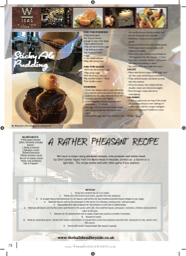 Sticky Ale Pudding By Matt John (The Waggon Inn, Uppermill) FOR THE PUDDING 230g pitted dates Ale of your choice, enough to just cover dates 125g unsalted butter 140g soft dark brown sugar 1 tsp baking powder 1tsp bicarb of soda 3 eggs 1⁄21⁄21⁄2 tsp vanilla extract 200g self-raising flflour FOR THE SAUCE 125G soft dark brown sugar 140g caster sugar 50ml ale of your choice 40g unsalted butter – dices 75ml double cream PUDDING the vanilla extract, baking powder and bicarb and gently mix together • Add flflour a little at a time and mix in gently • Once all the flflour has been added gently fold in your warm soaked dates until mixed thoroughly • Place into a line baking tray and bake at 150 degrees C for 45 minutes – 1 hour • Test with a wooden skewer – if it comes out clean the pudding is done • Set aside whilst you make the sauce SAUCE • Place dark brown sugar, caster sugar and ale into a pan and bring to a simmer • Then add the butter and allow to melt into the mixture • Once the butter has melted add the double cream and whisk thoroughly • Pass through a sieve and serve immediately TO SERVE • Portion a generous serving of the sticky ale pudding and pour over lashings of toffee sauce, and for a super indulgent treat add a scoop of vanilla ice cream Finally.....Enjoy! • Cover the dates in ale in a pan and bring to a simmer and cook until all the ale has soaked into the dates. Remove from the heat and allow to cool slightly • Cream together butter and sugar and then whisk until smooth • Add eggs one at a time and whisk slowly until incorporated into the butter and sugar • Once all the eggs have been mixed in add INGREDIENTS 4 Pheasant breast 200G Smoked streaky bacon 1 Bulb of fennel 1 Medium onion 250ml Red wine 250ml chicken stock Bunch of swiss chard 500g new potatoes Salt & Pepper We have a recipe using pheasant breasts, new potatoes and swiss chard by Chef James Taylor from the Bulls Head in Heyside, perfect as a starter or a light bite. The recipe works well with other game if you wanted. METHOD 1. Chop the smoked bacon in to strips Thinly slice the fennel and onion, quarter the new potatoes. 6. 8. 4. Remove bacon and fry the pheasant in the fat for 3-4 minutes, turning once and set aside. 5. Meanwhile boil new potatoes for 20 minutes or until soft in salted water. Remove pheasant and fry the onion and fennel in the juices until soft, then add the bacon, pheasant, red wine, chicken stock and red wine to the pan. 7. Simmer for 20 minutes then stir in swiss chard and cook for a further 5 minutes. 8. Season to taste. Plate by spooning bacon, fennel and onions onto bottom of a bowl then a few new potatoes and then the pheasant on top, spoon over the sauce. 9. Serve with some crusty breadI (the sauce is good). 2. 3. In a large heavy bottomed pan fry the bacon until all the fat has rendered and the bacon begins to go crispy. www.thebullsheadheyside.co.uk 78 www.AroundSADDLEWORTH.co.uk epiceR tnasaehP rehtar a