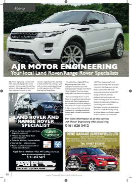 Motoring AJR MOTOR ENGINEERING Your local Land Rover/Range Rover Specialists AJR Motor Engineering is a team built from passionate, highly skilled motor engineers who love what they do.They believe in delivering simple, honest and clear advice and services to each customer regardless of the size of job at hand, whether that is taking a quick look at a loose exhaust pipe through to a full inspection of an ECU issue with high end Range Rover. Owned by Alister Rigby, AJR Motor Engineering take pride in their reputation to become one of the leading Specialist Garages in the North West of England.They only employ highly skilled mechanics and engineers. If you have a Range Rover or Land Rover, or an electronic fault with your vehicles.AJR Motor Engineering are the company you should be talking to. They have over 25 years of experience in these areas and have a far reaching reputation for providing exceptional service when it comes to electronics and ECUs. AJR Motor Engineering Provide repairs and servicing, MOT tests, ECU / electronic fault diagnostics and tyre fifitting / repairs.They offer both commercial and private vehicle MOT testing, mechanical, electrical, bodywork and crash repairs and routine servicing. If you live or work in Oldham, Rochdale, Bury, Middleton or surrounding areas of Greater Manchester and your car needs some attention, call AJR Motor Engineering for advice. Repairs on all other makes/ models of vehicles also undertaken. LAND ROVER AND RANGE ROVER SPECIALIST ✔ We use the latest specialist Land Rover diagnostic equipment! ✔ ‘We love the tricky Range Rover problems you hate!’ ✔ Collection & Delivery Service Available ✔ Courtesy Cars - Subject to status ✔ Repairs on all other makes/models of vehicles also undertaken. Clyde Street • Oldham • OL1 4HT (off Riponden Road) www.ajrmotorengineering.co.uk 0161 626 5412 For more information on all the services AJR Motor Engineering offer, please ring 0161 626 5412 DENE GARAGE (GREENFIELD) LTD Nigel Toone and Paul Dransfifield MOT Preparations • Air Con • Servicing • Tyres • Car Maintenance etc......... Elgin House, Saddleworth Business Park, Huddersfifield Road, Diggle, OL3 5PJ. Tel: 01457 872015 Email: dene_garage@hotmail.co.uk GET YOUR VEHICLE READY FOR SUMMER! 80 www.AroundSADDLEWORTH.co.uk