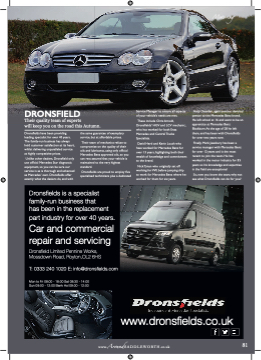 Motoring DRONSFIELD Their quality team of experts will keep you on the road this Autumn. Service Manager to ensure all aspects of your vehicle’s needs are met. These include Chris Arnold, Dronsfifields’ HGV and LCV mechanic, who has worked for both Enza Mercedes and Central Trucks Specialists. David Herd and Kevin Louth who have worked for Mercedes Benz for over 13 years, highlighting both their wealth of knowledge and commitment to the brand. Nick Tynan who originally set off working for VW, before jumping ship to work for Mercedes Benz where he worked for them for six years. Andy Dearden, again another devoted person to the Mercedes Benz brand. He left school at 16 and went to be an apprentice at Mercedes Benz Blackburn.At the age of 28 he left them, and has been with Dronsfifields for over two years now. Finally, Mark Jewsbury has been a service manager with Mercedes Benz for over 12 years and is the most recent to join the team. He has worked in the motor industry for 35 years so his knowledge and expertise in the fifield are exceptional So, now you know the team, why not see what Dronsfifields can do for you? Dronsfifields have been providing leading, specialist for over 40 years. The family-run business has always held customer satisfaction at its heart, whilst delivering unparalleled service at highly competitive prices. Unlike other dealers, Dronsfifield only use offificial Mercedes Star diagnostic equipment, so you can be sure our service is as is thorough and advanced as Mercedes’ own. Dronsfifields offer exactly what the dealers do, and with the same guarantee of exemplary service, but at affordable prices. Their team of mechanics refuse to compromise on the quality of their oils and lubricants, using only offificial Mercedes Benz approved oils, so you can rest assured that your vehicle is maintained to the very highest standard. Dronsfifields are proud to employ fifive specialised technicians plus a dedicated Dronsfifields is a specialist family-run business that has been in the replacement part industry for over 40 years. Car and commercial repair and servicing Dronsfifield Limited Pennine Works, Mossdown Road, Royton,OL2 6HS T: 0333 240 1020 E: info@dronsfifields.com Mon to Fri 08:00 - 18:00 Sat 08:30 - 14:00 Sun 09:00 - 12:00 Bank Hol 09:00 - 12:00 www.dronsfifields.co.uk www.AroundSADDLEWORTH.co.uk 81