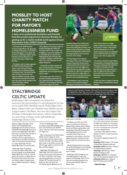 MOSSLEY TO HOST CHARITY MATCH FOR MAYOR’S HOMELESSNESS FUND A team of ex-professional footballers and formerly homeless people supported by Emmaus Mossley are gearing up for a charity football match against Greater Manchester Police (GMP) Tameside. homeless people by providing them with a home, support and work in a community setting. Each Emmaus runs different social enterprises, providing work and development opportunities whilst generating income to sustain the work of the charity. PC Steve Naylor from Greater Manchester Police, said:“Following the success of last year’s charity match, myself and Harry felt we had to do it again, but this time even bigger and better.We have increased the number of activities on offer and increased the youth tournament to eight teams, in the hope that we can raise even more funds for such a worthwhile cause. “Homelessness is still a recurring issue for many people throughout Manchester, including here in Tameside. Sport and Wellbeing I have visited a Bed For A Night shelter myself and can see the great work they are doing to help people who fifind themselves out on the streets. For this reason, my colleagues and I at GMP Tameside are happy to give our own time to support the event.” The Emmaus Charity Football Match will take place on Sunday 8 September from 2pm at Mossley A.F.C, Seel Park, 11 Market St, Mossley OL5 0ES. Entertainment for all ages will be on offer throughout the day as well as food, drinks and a charity rafflfle. Admission will be £5 and free for under-16s. To fifind out more or support Emmaus Mossley head to www.emmaus.org.uk/ mossley The Emmaus Vs GMP Tameside Charity Football Match will take place on Sunday 8 September at Seel Park in Mossley.Taking part in the game will be former professional players Daniel Nardiello and Guy Branston, and Greater Manchester Mayor Andy Burnham. The charity match is being organised by GMPs Tameside Division with support from Emmaus Mossley, Mossley A.F.C and Oldham Athletic Community Trust.The family-friendly event will also include local club mascots, inflflatable activities, charity rafflfle and face painting.All proceeds from the event will be donated to the Great Manchester Mayor’s Homelessness Fund. Harry Barlow, Community Leader at Emmaus Mossley, said: “We’re all looking forward to the rematch and bringing the community together for an enjoyable day for a good cause. Helping people less fortunate than ourselves is a big part of the Emmaus ethos and a real motivation for the players taking part. “I would like to thank everyone for their continued support of Emmaus Mossley and all the people and organisations who are supporting this charity match.” The Emmaus team will consist of formerly homeless people who are now supported by the charity, staff members and special guests. Emmaus communities support formerly Pictured at the Pre-season Friendly v Marine AFC, where the Foundation held a Disability Team ‘Open Day’ are (L to R) - Judi Kelly (Rotary Club), Gavin, Lee, Sam, Anthony, Joanne and Michael from the Stalybridge Celtic Blues team. STALYBRIDGE CELTIC UPDATE Stalybridge Celtic Foundation are pleased to announce the sponsorship of a new playing kit for one of our adult PAN-disability teams, Stalybridge Celtic Blues. Ahead of the new Cheshire East Ability Counts League season, the Blues, who won the League One Division of the league last season, will be competing in a new strip, courtesy of the Dukinfifield and Stalybridge Rotary Club. games each on the day. The Blues came fififth out of the seven, so well done to Chris, Lee, Wayne,Adam, Stephen, Sean, Michael, Daniel and Danny, a great effort, with Stalybridge Celtic AFG fifinishing fifirst and facing Ellesmere Port in the semi-fifinal, where they won on penalties to book a place in the Final against Stockport County, who had won the plate for the previous three years. Weekly Training Sessions start again for the 2019/20 season from Thursday 5th September 2019 at Ashton 6th Form College. Stalybridge Celtic Foundation are once again pleased to offer the support of Stalybridge Celtic FC for fifive local charities throughout the course of the 2019/20 season at Bower Fold. The Foundation will be handing over fifive of their Home fifixtures this season to enable each charity to come along and raise awareness of the work they do in our community and at the same time, raise valuable funds. Last season they helped to raise a fantastic £1,546.21 in total across the fifive charities. This season’s designated fifixtures are as follows - Saturday 5th October v FC United of Manchester (Reuben’s Retreat) Saturday 23rd November v Buxton FC (Willow Wood Hospice) Saturday 1st February v South Shields FC (Kidscan UK) Stephen Gilligan, President of The Rotary Club of Dukinfifield and Stalybridge said ‘The Rotary Club of Dukinfifield and Stalybridge is proud to sponsor the Stalybridge Celtic Blues this season and wish them the best of luck in the season ahead. Our members will try to get along to as many games as possible this season to cheer on the blues and look forward to a long relationship with the Stalybridge Celtic Community team.’ Stalybridge Celtic Foundation, Community Offificer, Mike Smith– ‘We are very grateful to the Dukinfifield & Stalybridge Rotary Club for a terrifific gesture to sponsor our Blues Team in their games next season, they look very smart indeed, a massive thank you to Stephen and Judi for making it happen’ The three Stalybridge Celtic Foundation adult PAN-disability teams have now fifinished for the 2018/19 season, with two of the teams fifinishing on a high note. After competing in the Cheshire East Ability Counts League for seven months, they took two teams to the Cheshire FA HQ in Northwich (20th July) to play in the Ability Counts Cup, which brings together teams from the East and West Leagues. Stalybridge Celtic Blues and Stalybridge Celtic AFG (Alternative Futures Group) were both placed 
