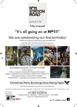 FuFulllylyLLicicensed “It’ʼs all going on at N 11” We are celebrating our fifirst birthday! New Menus including a light bites option available regular fifine dining theme nights and NEW Supper Club coming soon... Thank you to all our customers over the past year. Please contact for details and bookings Light bites option available, regular theme nights and the Supper Club! Please contact for details and bookings. 2 courses at lunch 12-2 for £12.99 Vegans, vegetarians aNnEdWalHl AdPiePtYaHryOrUeRq:uWiredmnesndtasyc-aThteuresdayfo(4r-7pm) Vegans, Vegetarians & all dietary requirements catered for Friday & Saturday 9am - 9am • Sunday 10am - 7pm Blue Room available for function hire (up to 20 people) For reservations please call Food times: Wednesday & Thursday 10am - 4pm • Friday 10am - 9pm • Saturday 9am - 9pm • Sunday 10am - 7pm Your perfect Marsden Jazz Festival retreat o Fully Licensed Father’s Day Bookings Now Being Taken Enjoy our garden terrace with heaters this season. .............................. Take Away Sunday Lunches Now Available Enjoy our fully licensed garden terrace with heaters this season... STEAK NIGHT - 2 steaks and a bottle of wine for £40 Your perfect summer retreat! Christmas Party Bookings Now Being Taken Food times: Wednesday & Thursday 9am - 7pm n 01 8 F 7 4 6 or r ese 4 4 rvat ions ple Blue Room available for function hire (up to 20 people) 01484 443976 11 Station Road • Marsden • West Yorkshire • HD7 6DG 11 Station Road • Marsden • West Yorkshire • HD7 6DG 4 3 as 9 e ca ll @chefteebis #chefteebis Proud to be main sponsors www..no11sttattiionrroad..co..uk non1o11s1tatsitoantioronardoad